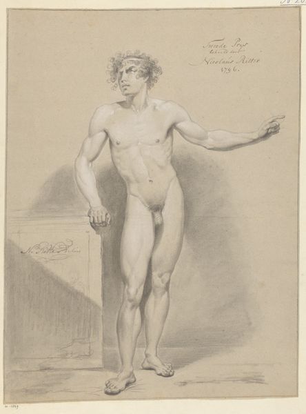 Editor: So, here we have "Standing Male Nude, Seen from the Front (2nd prize 1816)," likely from 1816, by Johannes Donker. It's a pencil drawing, rendered in sanguine. I’m struck by the pose, so poised yet also vulnerable. What leaps out at you when you see this piece? Curator: Vulnerability is an interesting take! I see that too, but also an incredible dedication to form. I wonder what he dreamt of while drawing him, Donker I mean. Perhaps he aspired to reach the ideals of classical art. But do you notice how the pose is both dynamic—with that arm pointing skyward—and also incredibly static? It is so classically, self-assuredly calm. Editor: I see what you mean! It is a very traditional pose, yet his slightly tilted head adds a touch of humanity, I suppose. Why do you think Donker chose this almost theatrical gesture, then? Curator: Ah, theatrical! I love that word choice! Yes, it has the ring of youthful declamation, doesn't it? Perhaps, he was inspired by the actors of the time, their exaggerated gestures. Art often mirrors its surrounding society, like actors mirroring the audience back at themselves. Or it is that very need to 'find one's way' expressed by a youth with a cane, the artist using himself as his first point of inspiration for everything in life, an artistic awakening. Editor: That's such a cool idea, an artistic awakening. I hadn’t thought of it that way, and it makes this piece far more relatable, even with its classical influences. Curator: Exactly! Finding those personal connections—that’s what makes art truly alive, even after centuries! We both learned that today.
