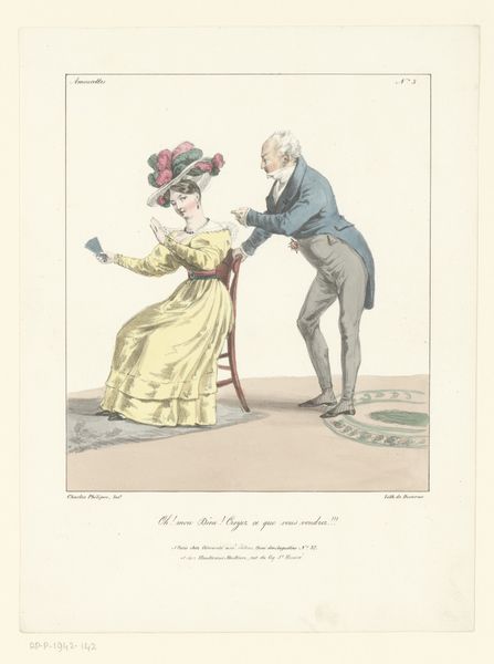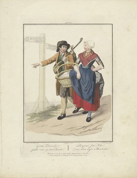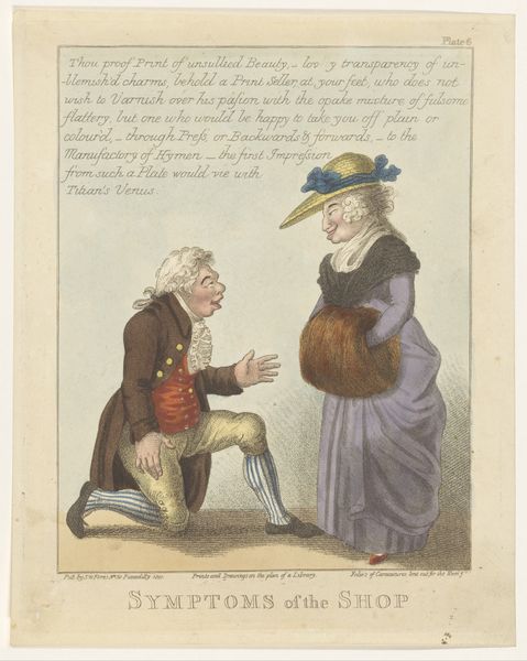 Editor: We’re looking at “Aanspreker,” an etching by Ludwig Gottlieb Portman from 1811, housed in the Rijksmuseum. The mood is… surprisingly humorous for a scene depicting a death announcement? What do you make of it? Curator: The humour stems from the subversion of societal norms and power dynamics of the era. It appears we have a ‘aanspreker’—someone who announces deaths— engaging with a woman. Considering its creation in 1811, how might the societal roles of men and women influence your understanding of this print as commentary? Editor: Well, he seems to be in a position of authority with the wig and formal attire. The woman appears more domestically situated. Is the humour in challenging that dynamic? Curator: Precisely! Portman, through caricature, offers a glimpse into the social fabric, questioning the rigid class and gender structures. Note the flamboyant gestures versus the woman's more grounded stance, and what could this juxtaposition be conveying about performativity and sincerity in grief. Who had the space for the performative during that period and why? Editor: So it's not just about death, but about how different members of society experienced and expressed grief. Class impacts gender. I’d missed the deeper connection there at first. Curator: And it begs the question of whether caricature always punches ‘up.’ Does the humour here also inadvertently reinforce existing social hierarchies, even as it critiques them? Editor: That gives me a lot to think about. I came in thinking this was simply a funny historical scene, but it reflects deeper tensions around gender and class performance. Thanks for the insight. Curator: It shows the potential of visual culture to reveal unspoken assumptions of a period, it encourages us to reflect on these societal frameworks both in the past and today.