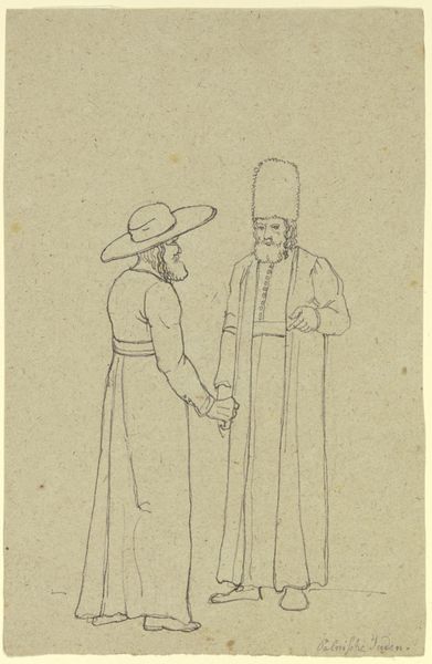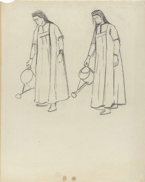 Curator: Immediately, I'm struck by the gentleness of this study; the pale colours almost whisper of a quiet moment captured. Editor: We're looking at “To studier af kvinder i udendørs påklædning," or "Two Studies of Women in Outdoor Clothing," a drawing by Martinus Rørbye, created with colored pencil in 1832, and currently held at the SMK, the National Gallery of Denmark. Rørbye was an important figure in the Danish Golden Age of painting, known for his travel scenes and genre paintings. Curator: Rørbye’s subtle color choices—the restrained use of pinks and grays—give a certain melancholy to the image, almost as if they are studies for an allegory. And the contrast between the two figures, one cloaked and covered, the other, lighter, seemingly youthful. What could they signify together? Perhaps an anticipation of life against the weariness of age? Editor: The very delicate hatching that defines their shapes is quite beautiful. He's achieved incredible volume and texture with such spare means. The lines that depict their dresses, especially on the right, achieve a graceful sense of the body underneath those fabrics. And the limited palette adds to this feeling of soft interiority. Curator: Their costumes—particularly the hats and capes—speak volumes about social status and societal constraints. Clothes can operate as performative gestures in art. Consider the semiotics of dress: each accessory, drape, and fold communicating codes of Danish cultural life during the early nineteenth century. What did those garments do, beyond protection against weather, in forming their sense of identity, or broadcasting belonging to others? Editor: What you mention regarding social status and Danish society gives this piece an almost anthropological feeling, even as the overall tone leans into a sensitive emotionality, perfectly evoking the Romantic era's penchant for idealized feeling, if tempered here. Curator: It's a compelling, quiet composition offering much to unpack. I keep returning to the sense of mystery held within those modest lines and colours. Editor: For me, it is the visual intelligence shown in rendering with precision the tonal weights and the tactile quality of cloth that marks Rørbye's genius in such unassuming format.