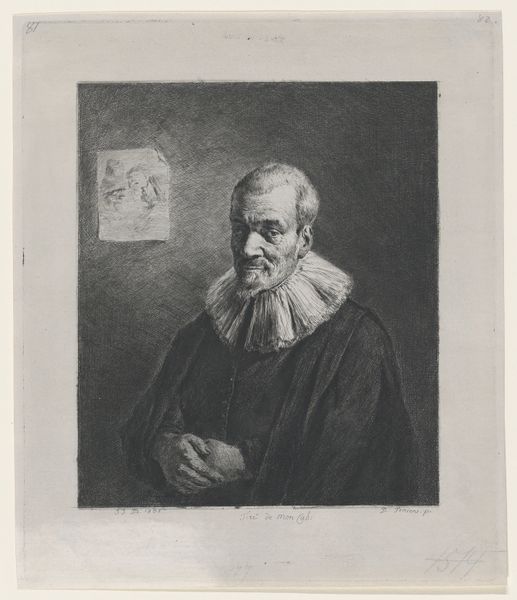 Curator: This intriguing print is titled “H. Paulus” by James McArdell, dating approximately from the 1740s to the 1750s. Editor: The fellow seems troubled, almost weathered, like an old oak facing a storm. The stark contrast in tone gives the image such raw, immediate impact. Curator: Precisely. Note the deliberate use of light and shadow, a classic Baroque characteristic. McArdell uses engraving and graphite to define not only the form, but also imbue the work with emotional depth. His technique facilitates a compelling rendering of texture, particularly evident in the subject’s beard and the folds of his garments. Editor: He looks like he’s seen things, doesn’t he? As though a story is etched onto his very face, each line a chapter. One can only wonder about the unvarnished tale behind his haunted eyes. Curator: Indeed, one could see his gaze as a carefully constructed element within the composition. McArdell guides the viewer's eye to follow his subject’s gaze, heightening the sense of introspection and contemplation. It suggests the man is engaged in an internal dialogue. Editor: I imagine him standing amidst the bustling marketplaces of that era. What thoughts brewed in that mind? Was he simply contemplating the price of bread, or wrestling with matters of conscience? The man’s character feels robustly complex! Curator: I appreciate how your perspective brings forth those societal tensions which permeate through Baroque art. McArdell offers us a canvas where history, emotion and aesthetic skill converge to incite inquiry. Editor: In art as in life, looking closely almost always delivers something profound. This Paulus feels no different—the whispers of eras gone echoing. Curator: True, the work transcends time. Thank you for the engaging reading—you have broadened our understanding through the subjective responses.
