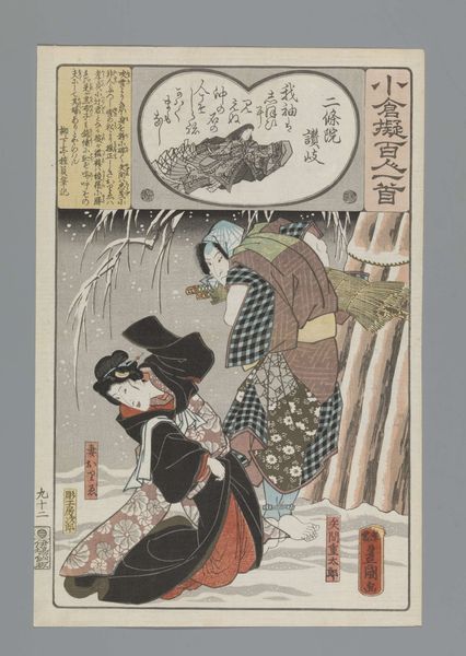 Curator: I’m immediately struck by the intricate detail in this woodblock print; the delicate floral patterns of the kimono juxtaposed against the solid geometry of the window frame... it's really captivating. Editor: It is a lovely piece. What exactly are we looking at here? Curator: This is “Imperial Princess Shokushi, Ogura Imitation of the One Hundred Poems” by Utagawa Kunisada, created sometime between 1847 and 1850. Currently it resides here at the Rijksmuseum. Editor: "Ogura Imitation"...is that title telling us something about its creation and cultural moment? Curator: Precisely! "One Hundred Poems" refers to the "Ogura Hyakunin Isshu", a renowned collection of waka poetry. Kunisada and other artists frequently created Ukiyo-e prints interpreting these poems and their associated imagery. Shokushi, the Imperial Princess featured, was herself a prominent poet. So, it is about layering cultural references. The artist takes classical literature and re-presents it to a contemporary audience. The figure at the top might even allude to one of her poems. Editor: So we are looking at an act of interpretation in two stages? It makes one wonder, what were the societal pressures and popular interests that encouraged or shaped Kunisada's creative process? Was he just trying to create a profitable product for a burgeoning market? Curator: Kunisada certainly understood his market. Ukiyo-e prints were incredibly popular with the rising middle class in Edo-period Japan, feeding an appetite for both high art and popular culture. Notice the kabuki actor perched within the window. These actor portraits served as a form of celebrity endorsement. They also blurred the line between traditional and popular values of the period. Editor: Absolutely. And those small details - like the hanging wind chime – whisper of daily life and fleeting beauty, concepts crucial to Ukiyo-e tradition. One begins to understand more broadly the visual vocabulary of its cultural traditions. It feels like something of an aesthetic bridge! Curator: A wonderful thought. It speaks to how Ukiyo-e provided visual narratives, both poetic and playful, connecting audiences to their heritage. Editor: Ultimately, it showcases a wonderful fusion between social and cultural representation in 19th century Japanese art.