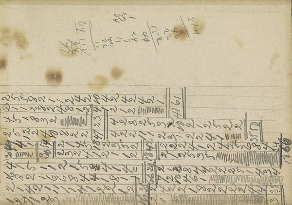 Editor: This is "Book of Woven Coverlet Designs (Draft)" from 1839 by Daniel Stephenson. It's a mixed-media drawing with ink on paper. It reminds me of musical notation because of all the parallel lines. What do you see in this piece? Curator: I see a powerful testament to the lives of women in 19th century America. These meticulously drawn weaving patterns aren’t just decorative; they're a form of coded language and cultural preservation. Weaving was often a communal activity and economic necessity for women. Editor: Coded language? How so? Curator: Each pattern represented more than aesthetics; it was about sharing knowledge, passing down traditions, and perhaps even a subtle form of resistance in a patriarchal society. These women are using their craft as a medium for storytelling, reinforcing communal bonds. The names of the patterns themselves, like "The Rising Sun", evoke nature, and even sociopolitical events—a fascinating blend of the personal and political. Consider how literacy was limited, particularly for women and marginalized communities. Editor: So, the patterns are ways of preserving oral history and social structures through textile production? Curator: Precisely. It also makes you think about the economic agency afforded to women through their craft. Can you think of any other examples in history where textiles and coded messages intertwine to speak truth to power? Editor: I hadn’t thought about textiles as a form of cultural resistance, but this gives me a whole new perspective on art history! Curator: It reminds us to look beyond the surface and question whose voices are present – or absent – in traditional narratives.