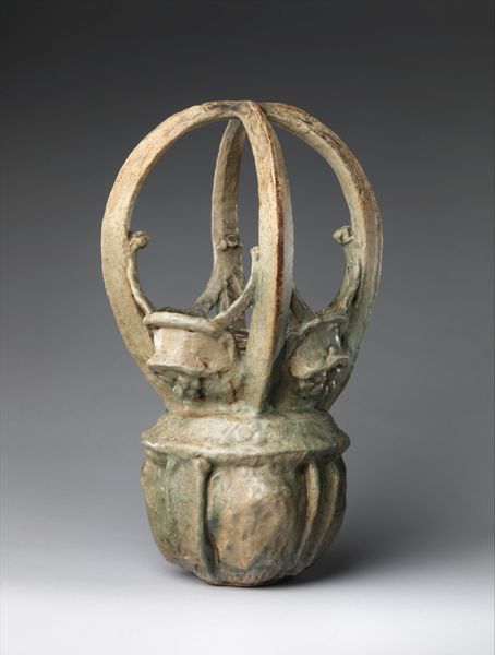 Editor: This striking ceramic sculpture, known as "Vessel," dates back to around 500 AD. It's currently housed here at the Minneapolis Institute of Art. It’s strangely compelling, almost like a miniature, ancient table or altar. What strikes you about this piece? Curator: What’s compelling here is how this object transcends a simple designation like ‘vessel.’ Think about the labor involved in its creation, from sourcing the clay to firing it. How did the makers’ hands shape this piece, and what social roles did those potters hold? Was this a widely available form, or crafted for specific rituals and consumers? Editor: I hadn’t considered that aspect, focusing more on the aesthetic elements like the animal figures. What about the form itself – the three legs, the geometric designs? Do those suggest a functional purpose? Curator: Absolutely, but we shouldn’t separate form from its material existence and means of production. The form directly relates to the intended use and how the makers negotiated the inherent properties of clay to build such an unusual object. Think of how each leg was formed, the challenge of joining them to the central body. This reflects choices made within the context of available resources and techniques. Are there similar ceramics produced using the same production workflows or is it unique, pointing to specialized labor? Editor: So you’re saying that to understand the “vessel”, we must see it in the full scope of materials and creation process… It’s more than just its looks. Curator: Exactly. By scrutinizing its materiality and the traces of labor embedded in it, we gain a much richer insight into the lives and society that produced it. What kind of tools, what social position that person occupied, all influence that material output. Editor: I'll definitely be considering these aspects moving forward. I see now how a focus on materials transforms our understanding. Thanks! Curator: Glad to share a different lens to analyze and contextualize. I also learned from considering the impact the “animal figures” have in shifting its perception.