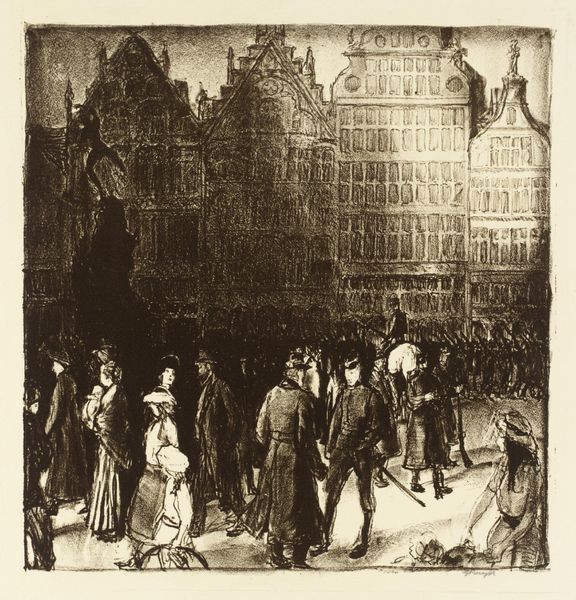 José M. Pavón created this lithograph titled ‘14th Street, N.Y.’ using shades of grey that render a politically charged urban scene. The image shows a demonstration against war, set against the backdrop of a bustling New York street. The artist’s skillful use of lithography captures the textures of the city architecture and the dynamic energy of the crowd. The composition is structured with a strong horizontal emphasis, reinforcing the linear perspective of the street. Pavón masterfully contrasts light and shadow to create depth, highlighting the textures of the buildings and the figures marching below. Note how the signs held by the protestors add a layer of semiotic meaning, conveying messages against war and fascism. These signs act as cultural codes that invite the viewer to engage with the social and political context of the time. Consider how the formal elements of the artwork—the careful arrangement of figures, the use of light, and the textual inclusions—combine to form a powerful commentary on society. This piece serves as a potent reminder of art’s capacity to reflect and critique socio-political issues.