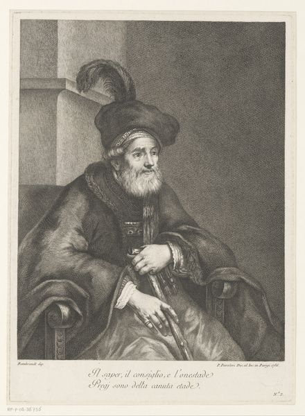 Editor: This is William Pether's "King Uzziah afflicted with leprosy," an etching and engraving, sometime between 1741 and 1800. There’s something immediately unsettling about the portrait – his gaze is intense, and his hands seem almost pleading. What do you see in this piece? Curator: I see a potent depiction of power and vulnerability, inextricably linked. Consider the socio-political climate in which this was made; royalty was often presented as divinely ordained. But here, Uzziah, a biblical king, is stripped of his divine right by disease, a tangible consequence for defying religious law. How does this challenge the established narrative of leadership and authority? Editor: It feels like a criticism of the ruling class. Is Pether suggesting earthly power doesn't equal immunity from human suffering? Curator: Precisely! It reflects evolving societal attitudes towards those in power. Note the stark contrast between the opulent robes and Uzziah's very human, suffering face. It encourages a discourse about accountability. Consider too, the history of depicting disease; it often carried moral weight, a visible sign of sin or divine displeasure. Do you see this operating here? Editor: Absolutely. Leprosy serves as a physical manifestation of his transgression, not just a disease. Curator: Indeed. And what does it say that this intimate, flawed depiction of a leader is now on display, open to scrutiny? What kind of power dynamics are at play between the artwork, the viewer, and the history it represents? Editor: It’s fascinating to see how a historical artwork can still spark important questions about power, accountability, and representation. Curator: And that is exactly the power of art - to serve as a mirror reflecting our own socio-political realities, while inviting critical engagement.
