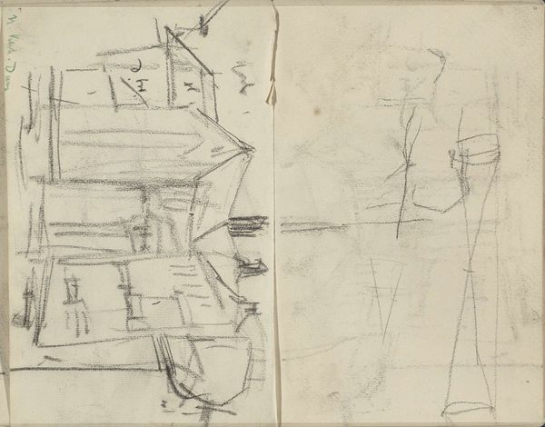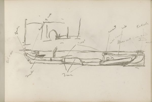 Editor: So, this is "Bridge over the Brouwersgracht in Amsterdam near the Binnen Brouwersstraat," a graphite drawing on toned paper by George Hendrik Breitner, dating from between 1886 and 1903. It's a very quick sketch, almost like a fleeting impression. What strikes you most about it? Curator: Well, what immediately jumps out is the sketch's almost defiant embrace of modernity. Breitner, often dubbed the 'painter of Amsterdam,' wasn’t just capturing a cityscape; he was capturing the pulse of a rapidly changing urban environment. Think about the period—late 19th century. Amsterdam was transforming into a bustling hub. Does the sketch convey that sensation to you? Editor: I can see that. It feels unfinished, almost chaotic, which matches the energy I associate with cities. What’s the significance of the bridge itself? Curator: Bridges, especially in a city defined by canals, served as crucial arteries. They facilitated commerce, communication, and social interaction. Breitner's choice to depict it underscores the significance of infrastructure in shaping urban life and social connections. We should consider what a 'bridge' represents conceptually too. What could the bridge symbolise? Editor: Maybe connection? Or the idea of moving from one place, one social class, to another? Curator: Precisely. And, considering Breitner’s documented fascination with capturing the ‘everyday,’ how do you see this sketch fitting into the broader art world's engagement with realism and naturalism at the time? Editor: It feels more immediate and less posed than traditional portraits or landscapes. It seems almost anti-establishment in its casualness. Curator: It certainly deviates from the polished Salon style of the time, favoring instead a gritty realism, deeply influenced by Impressionism but rooted in capturing the raw energy of urban life. Do you feel this work invites you in? Editor: Definitely. Seeing this, I get the sense I could understand Amsterdam at the time by simply turning the page. I can almost feel the city moving, it’s interesting to think about what this snapshot of the city conveys. Curator: Indeed. And reflecting upon Breitner's role in documenting the evolving urban landscape enriches our perspective not only of this artwork, but also urban history as a whole.