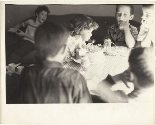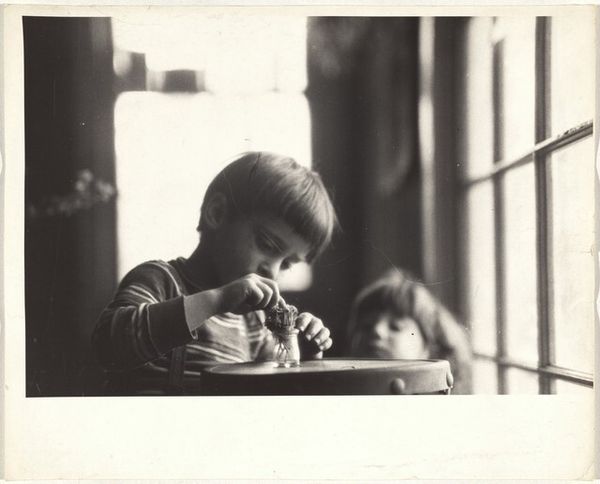 Curator: Robert Frank’s gelatin-silver print, "Festival—Children," created circa 1941, offers a poignant snapshot of childhood and cultural identity during a turbulent historical period. Editor: My first impression? Quiet industry. It’s got a nostalgic charm, a grainy softness that speaks of simpler times, yet the boy with the hammer, that intent look, it’s more complicated than pure innocence. Curator: It is tempting to think about the ways traditional festivities and expressions of national pride played out in children’s lives during the early 1940s. We must ask: what did cultural celebrations look like amidst war and displacement? How was national identity cultivated and instilled in the younger generation? The image provides clues for us to consider Swiss identity during the time. Editor: Totally, there's definitely that sense of national identity simmering. You see the pitcher with the Swiss cross boldly in the foreground, right? It feels staged, somehow, yet candid. That cross, it's not just decoration; it's a statement. Plus, the kid’s got a serious hammer, he is making something happen. He seems to me like he's creating identity through making. Curator: It’s fascinating how Frank uses seemingly everyday moments to reflect on broader societal structures. Think about gender, for instance: is this domestic activity traditionally gendered? Who is observing, who is participating? It becomes clear we need to examine the subtle yet powerful ways identity is formed within communal practices, with social boundaries and power dynamics embedded even in playful scenarios. Editor: See, to me, it’s just about that boy and his task, the way the light falls on the scene, highlighting his concentration. And all that lovely detail fading off around the edges... that's the magic! Curator: That magic you feel, it stems from real circumstances and tangible things. It’s about connecting this boy's actions with his historical context to allow a nuanced engagement. Editor: True. It gives a depth to a seemingly fleeting glimpse. Frank's made something lasting out of what felt so temporary, a memory that triggers other memories. It's pretty cool.