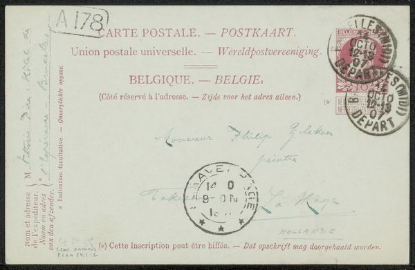Curator: This mixed-media work on paper is titled "Briefkaart aan Philip Zilcken." The attribution suggests Vittorio Pica as the sender, and we believe it originates from somewhere between 1907 and 1918. It's a fascinating glimpse into early 20th-century correspondence. Editor: You know, it gives me a strangely intimate feeling, peering at someone's old mail. The handwritten script, the aged paper…it feels like whispering secrets from the past. Curator: The visual texture certainly enhances that feeling. Consider the compositional elements. The stamp, the postmark, the different scripts—they create a complex yet balanced whole, a carefully arranged interplay of form and information. Note the faded ink of the handwritten address juxtaposed against the standardized print of the postcard itself, how that opposition underscores themes of the individual versus the institutional. Editor: I'm drawn to the handwriting—so personal, almost performative. And "Très-pressé"—urgent! One wonders what was so important, the essence of that human connection lost now to time, surviving only in impression. What could drive someone to quickly draft and deliver their thought on an unassuming paper such as this? Curator: Indeed. And let us examine the stamp itself. The allegorical figure depicted speaks to a national identity being deliberately and carefully cultivated. This particular image invites the viewer to understand this correspondence within its specific socio-political context. The material, humble, even banal—suddenly transcends. Editor: It's more than just socio-political to me, somehow it creates a portrait of two individuals—sender and receiver. A whole unseen relationship surfaces as I start connecting some basic facts, creating narratives about lives, thoughts and intentions! I am filled with stories just looking at a seemingly simple piece of mail! Curator: I can appreciate your subjective interpretation. By examining the relationship between text and image, typography and handwriting, institutional marking and individual expression we observe how all these levels intertwine, enriching the semiotic density. It serves as a good illustration of a world on the brink of monumental change, even a world that no longer is with the way we correspond these days. Editor: True! And as such it serves as a tangible record that now, it's our turn to weave these narratives from fleeting evidence of long ago lives! A true journey that has had me captivated since its opening glance.