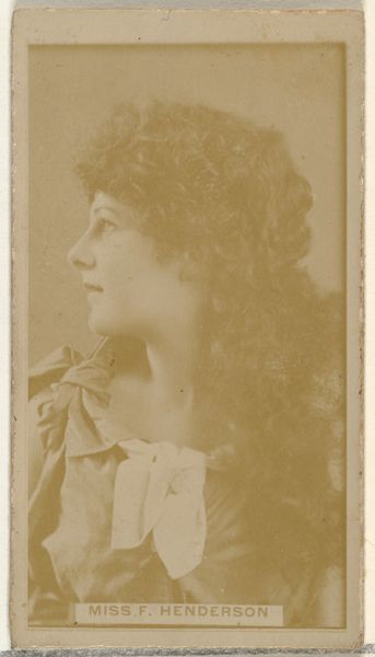 Editor: This is "Miss Eames," from the Actors and Actresses series, created by Allen & Ginter between 1885 and 1891. It's a small print. I'm struck by how soft the image is, almost dreamlike. What stands out to you from a formalist perspective? Curator: The chromatic restraint immediately compels attention. The limited tonal range—various shades of sepia—creates a flattening effect, pushing the pictorial elements toward the surface. Notice how the soft focus further reduces depth, emphasizing the two-dimensionality of the print. Does this lack of contrast impact your perception? Editor: Yes, it feels very delicate and ephemeral, almost like a memory fading. Is that intentional, do you think, or is it simply a product of the printing techniques available at the time? Curator: The aesthetic outcome is primary; the effect transcends mere technical limitation. The artist, knowingly or not, harnesses these constraints to elevate the image into a study of surface and texture. Observe the interplay between the smooth planes of her face and the textured rendering of her hair and lace. This is art about art. Editor: So you're saying the value isn't in representing Miss Eames herself, but more about how the print explores form and texture? Curator: Precisely. The subject is secondary to the arrangement of visual elements and their engagement with the medium itself. The image presents as a study of photographic form. Do you notice the delicate balance that shapes the composition into art itself? Editor: I see what you mean. By focusing on its inherent visual qualities, you see something more than just a portrait. It’s an exercise in seeing itself. Curator: Indeed. Considering these elements reveals that this small print presents many complex and rich ways for an audience to consider texture, pattern and light. Editor: I had not noticed that this picture offers formal properties to reflect upon, beyond a quick representation of the model. I'll explore other photographs with a different approach now!