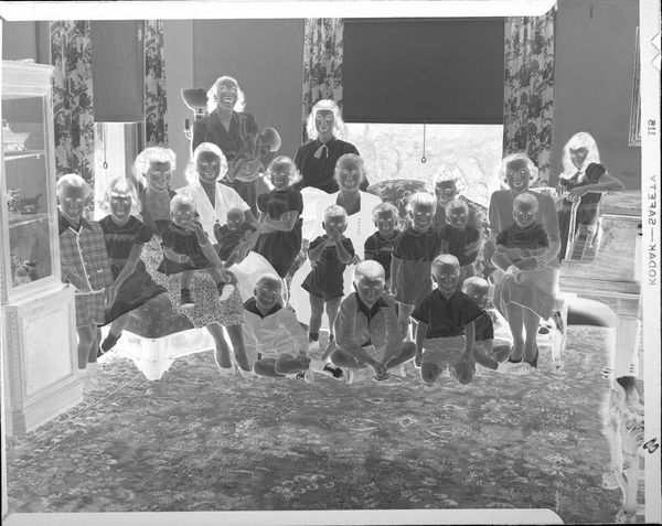 Curator: This photograph, taken by Lucian and Mary Brown, captures a scene of children sitting around a table eating, with mothers assisting. It measures about 10 by 12 centimeters. The high contrast of the negative print creates a rather stark mood. Editor: The composition is interesting, isn’t it? The arrangement of the children around the table creates a circular rhythm, emphasized by the inverted tones. Curator: It is compelling! The photo documents a moment of domestic labor, showing women actively involved in childcare and food preparation, reflecting the social expectations of their roles within the family. Editor: The contrast and tonal inversions highlight the textures and forms in the setting and upon closer observation, the women, children, and table setting are cast in an eerie, dreamlike glow. Curator: The image also speaks to the materiality of photography itself; this negative reveals the process of image-making, reminding us of the labor involved in producing such visual records. Editor: Yes, its composition and contrast draw me into its unique structure. It challenges traditional portraiture with an unconventional point of view. Curator: Indeed, and considering the context of its creation, it offers a perspective on gendered labor and social relationships. Editor: A fleeting moment rendered permanent through light and chemistry.