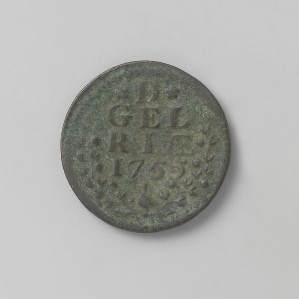Editor: This is a "Gelderse duit" from 1754, issued by the Province of Gelderland. It's quite small, made of copper, I think? Its patinated surface gives it an aged appearance. I am intrigued by the balance between text and imagery within a circular format. How should we understand the form of this coin, viewed simply as an aesthetic object? Curator: It is, above all, a testament to the power of carefully considered composition. Note how the central inscription, "D GELRIA 1754," is framed by laurel branches and surmounted by stylized florets. Observe also the small bird that acts as a stabilizing feature. What sort of relationships can you see emerging through these juxtapositions? Editor: Well, there is a juxtaposition between text and nature, maybe? I can’t really find another one, but the coin seems so rigid, due to the circular shape. Curator: The very circular shape suggests a self-contained system, a totality. How do the different surface textures contribute to this effect? Do you note how the raised letters and floral design create a play of light and shadow? Consider the material itself. The coppery hue and its aged surface, does it impart a sense of history, perhaps, to the piece? Editor: I hadn't considered how the play of light enhances its three-dimensionality. Now I can see that the laurel branches soften the rigid lettering, which enhances a dialogue between the geometry and the organic. The coin, after all, gains aesthetic quality in the relationship between its forms and patinated surface. Curator: Indeed. By observing these elements, we appreciate not only its functional utility, but its formal artistry as well. Editor: I am not used to seeing the currency with formalist's eyes! It shows how applying pure looking has no boundaries in terms of art or everyday objects. Curator: Exactly! The principles of form, color, and texture are ever-present, if only we have eyes to see them.