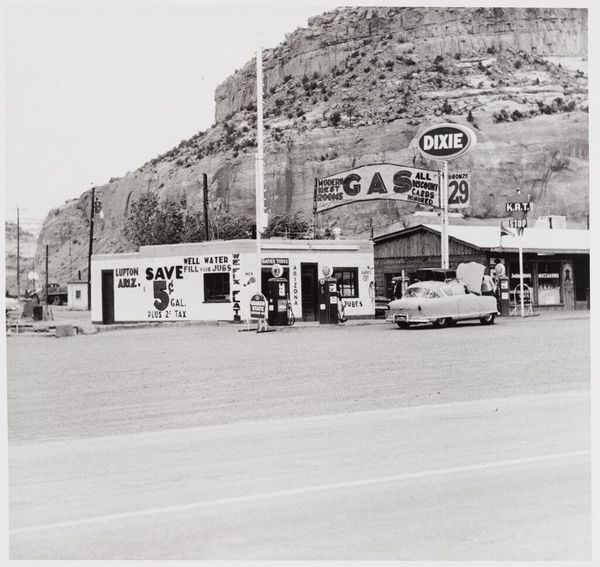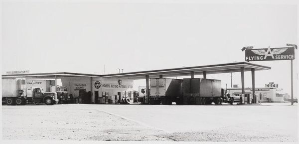 Curator: This photograph, "Union - Needles, CA," by Edward Ruscha, offers a quintessential glimpse into mid-century American roadside culture. Editor: Bleak, somehow. Like a stage set waiting for a play about loneliness. The high contrast and flat light make it feel so…exposed. Curator: Ruscha, known for his detached, almost clinical approach, documented these scenes as part of the evolving landscape and its commercial iconography. The gas station as a modern monument. Editor: Monument is interesting, because I keep seeing it as… impermanent. Like it could all just blow away into the desert. Is that Ruscha being critical, or just observant? Curator: Perhaps both. He presents the scene without judgment, allowing us to contemplate the cultural weight of these everyday places and the impact of consumerism on the American West. Editor: So, a deadpan eulogy for a disappearing world? I get it. Makes the emptiness feel even heavier.