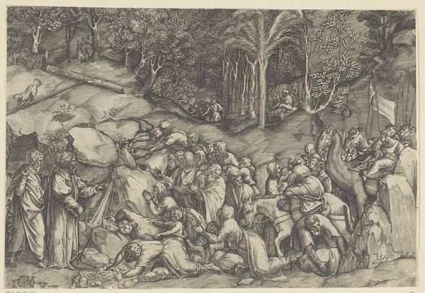Curator: Let's explore this print, “Johannes de Doper predikt tot de menigte,” or “John the Baptist preaching to the crowd,” attributed to Nicolaes de Bruyn, though created sometime between 1581 and 1656. Editor: My first thought is how somber the entire scene is. The monochromatic medium emphasizes that seriousness, while the densely packed figures lend a collective, attentive energy to the image. Curator: Indeed. Considering de Bruyn's focus as a printmaker, the act of disseminating religious narratives becomes critical. The technique used here, etching and engraving, allowed for wider reproduction and therefore a broader reach. This becomes particularly important within the social and religious conflicts of the period. Editor: The central placement of John, slightly elevated on a small rise, really makes you think about the weight of prophecy and authority at the time. The crowd is fascinating; such a varied group of individuals distinguished by their garments – some appear wealthy and others quite simple. It underscores John’s message as being for everyone. Curator: Absolutely. It brings into question who was purchasing and consuming such prints, who had access to these stories and the resources to learn and internalize the messages. We should also not ignore the skill involved in creating such textures of light and shadow, especially for pedagogical purposes. Editor: Look closely at the details within the garments, though – their folds, embellishments – really convey so much about status, belief, and the symbolic language communicated through dress at that time. This even extends to things such as prayer beads. They speak volumes about the wearer’s affiliations and spirituality. Curator: It also highlights how consumer goods are being co-opted to display religious status, therefore playing into this religious competition. But seeing these intricate techniques also illuminates this complex production history which makes its impact stronger. Editor: It reminds us that while the print illustrates a specific biblical moment, it resonates through layers of social hierarchy. The symbolism goes beyond scripture – each face and fold hints at the spiritual and societal climate. Curator: A potent visual expression through detailed labor – it demonstrates not only a devotion, but also a shrewd production of belief in times of tension. Editor: Indeed, these visual allegories gave strength, reinforcing devotion while silently speaking through their coded languages.