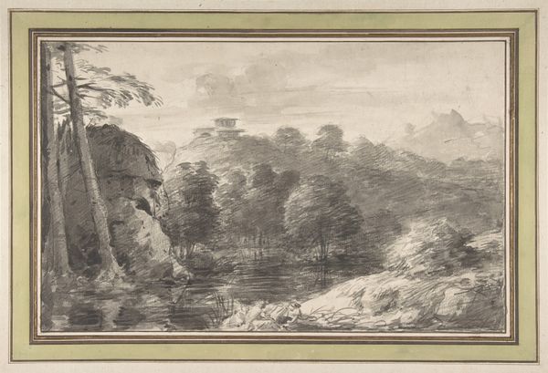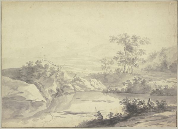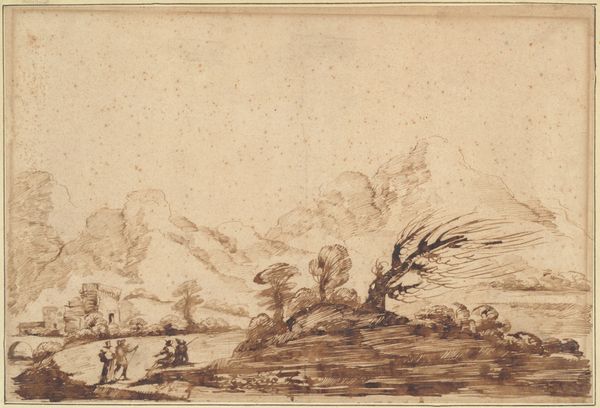 Editor: Okay, next up, we have a landscape drawing. The full title is, "Bergweg am Fuße von Felsen, an der Biegung durch einen Lattenzaun begrenzt, im Vordergrund Hirten, Rinder und Schafe" which roughly translates to "Mountain path at the foot of rocks, bordered at the bend by a fence, in the foreground shepherds, cattle and sheep." It's attributed to Heinrich Wüst and I’m presuming it’s pencil, ink and gouache on paper. The muted tones really give it a melancholic feel, don't they? What jumps out at you about this work? Curator: Oh, this one…it feels like a memory, a half-forgotten dream shimmering at the edge of consciousness. It's not just a landscape; it's a state of mind. Look at the way the light almost caresses those massive boulders; it’s less about geological accuracy and more about imbuing them with a sense of quiet, enduring presence. Wüst, he's not just showing us a scene, is he? He's inviting us to step into its mood. Do you feel it, that subtle yearning? Editor: Absolutely, the rocks have a almost mythical quality, and the way he renders the light almost feels spiritual. I’m interested in that tension, that contrast between the tangible—the fence, the animals—and that ethereal light you’re describing. How do you read that relationship? Curator: Isn’t that what life is, darling? The fence, a man-made barrier, perhaps a symbol of the constraints we place on ourselves, versus the vast, unyielding freedom of nature…the animals roam freely. But it’s the light that unites them. It hints that maybe, just maybe, we can find harmony in this dance between control and surrender. That melancholic mood you pointed out? I see it as less sadness and more…acceptance. Acceptance of the transient nature of things, you know? Editor: I didn't think about the fence representing limitations, or acceptance instead of sadness. That's really beautiful. I love how one little sketch can hold so much. Curator: Precisely. A simple scene, elevated into a space for reflection. Always leave room for introspection, you know? It can make the world more approachable, a space for ourselves, with space to simply…be.