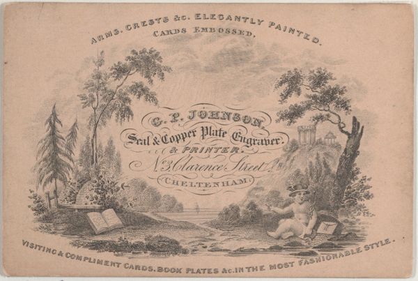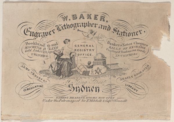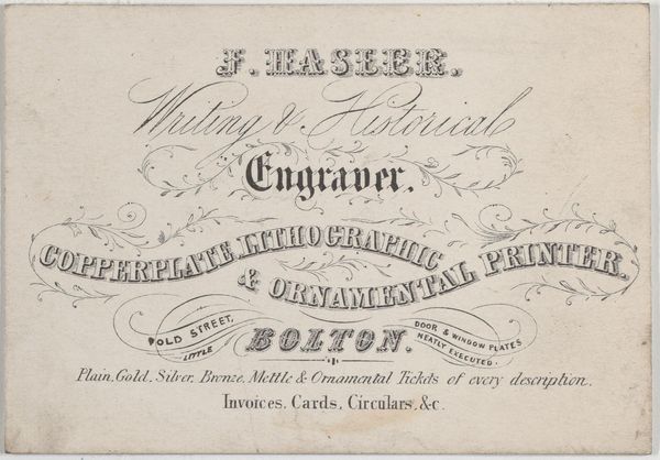 Editor: Here we have a trade card for J. Crosland, dating sometime between 1800 and 1900. It’s an engraving and lithograph promoting Crosland's business as an engraver, printer, and lithographer in London. I’m struck by how detailed and ornate it is. What does this card tell you? Curator: It speaks volumes about the material conditions of the printing trade during that period. Look at the variety of services advertised – from maps and charts to "Bankers Checks & Bills" and "Door & Window Plates." This suggests a broad customer base and a flexible production process. How do you think the specific materials – stone, metal – informed the type of engraving and lithography Crosland offered? Editor: I hadn’t thought about it that way! So the materials dictated, in part, the kind of commissions Crosland could fulfill? The ability to engrave on both stone and metal meant he wasn’t limited to just one type of project? Curator: Exactly. Consider also the implications of offering "Heraldic Engraving." This implies catering to a specific social class, those who possessed or desired such status symbols. Furthermore, notice the address, “81 Cheapside, near the Old Jewry." The geographical location suggests something about his clientele and suppliers, doesn't it? What kind of materials might have been sourced nearby? Editor: Now I see! He was likely sourcing paper, inks, and other materials from local businesses. It really puts the trade card in a new light – as part of a larger network of production and consumption. Curator: Indeed. This isn't just advertising; it's a material object embedded within a complex economic and social fabric. Understanding these relationships helps us understand the art's value in its own time. Editor: I never considered a trade card as such a complex source of information about materials and production. Thanks!