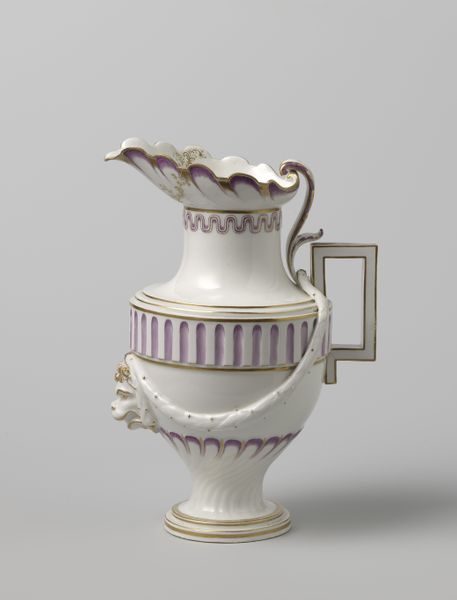 Editor: This is the "Liberty cup and saucer" crafted in 1876 by Union Porcelain Works. I find its almost austere color palette softened by the figural elements and, of course, the gold trim. How would you interpret a work like this? Curator: It's fascinating how this cup and saucer set encapsulates the contradictions inherent in America's Gilded Age. On one hand, you have this aspiration toward classical ideals, seen in the Wedgwood-inspired bas-relief figures which evokes a sense of timelessness and order, almost aristocratic. Yet, that aesthetic is achieved by the hands of largely immigrant labor within a burgeoning industrial capitalist system which fostered huge disparities in wealth. How do you think those visual contradictions and aesthetic choices played out? Editor: Well, the cup feels very European in its aesthetic but was intended to celebrate American Liberty. Was this perhaps intended to create some form of dialogue, to either emulate European culture, while forging a new identity for America? Curator: Exactly! The neo-classical figures evoke enlightenment ideals of liberty and reason and, on the other hand, we also see corn stalks-- a nod to America's agricultural wealth and frontier identity. And, look closer – notice how a figure, likely intended to symbolize freedom, supports the drinker in using the cup. We have to examine who was, and still is, considered "free" within such systems of power, who gets to enjoy this alleged "liberty," and at whose expense? The porcelain itself signifies luxury, making this more than a simple cup; it's a statement, a reflection of societal aspirations and blind spots. Editor: I never thought about porcelain speaking to these sociopolitical elements! Curator: Porcelain, like many materials, always has a story to tell beyond the aesthetic surface. Engaging with those histories lets us address the important questions that still resonate today.