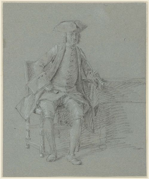 Editor: So, here we have an intriguing piece from the Rijksmuseum, titled "Man zittend op een stoel met de benen over elkaar"—or "Man sitting on a chair with legs crossed." It’s an anonymous work, done with pencil, sometime between 1700 and 1800. There’s something wonderfully casual and intimate about it, despite its age and the formality of the sitter’s clothing. It’s like we're catching him off guard. What strikes you most about this drawing? Curator: Off guard indeed! It reminds me of stumbling upon a half-remembered dream. See how the artist captured him; his posture almost whispers secrets, doesn’t it? A sketch from the Baroque era offers a glimpse, but, perhaps more importantly, leaves much unsaid. One might wonder: what preoccupied his thoughts? It's as if the drawing itself breathes with unspoken stories and veiled mysteries! The soft pencil lines and that paper shade feel aged with intention. Do you get a sense of the social standing of the figure by looking at his apparel, Editor? Editor: I do, but the slightly hurried, unfinished nature of the sketch feels like it almost democratizes him, if that makes sense. Like, beneath the powdered wig and fancy coat, he's just… a guy. Do you think the anonymity adds or detracts from the artwork's impact? Curator: Ah, beautifully observed. Yes! Stripped from historical tether, we're each free to place him on a unique pedestal; endowing his form with new meanings - perhaps shadows, or perhaps sunlit corners in the soul. Anonymity can serve like open invitations for dialogue, prompting all to reflect their own narrative onto him - it really depends. What emotions does his presence draw from *you* most prominently, gazing at him, Editor? Editor: I think I am left to feel, like him, expectant. Maybe now that I know so much more, I feel it with knowledge. Curator: Then he’s succeeded – he's left you expecting the dawn alongside him.