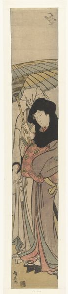 Curator: Here at the Rijksmuseum, we're fortunate to have this striking woodblock print by Torii Kiyonaga, made between 1779 and 1783. The title translates to "Two Courtesans Looking Aside Under a Blossoming Cherry Tree." Editor: My first impression is one of gentle melancholy. There's a poised stillness about the figures, despite them both looking slightly away, their gazes directed elsewhere. It's a composition layered with a sense of subtle yearning, and maybe even world-weariness. Curator: Yes, the figures definitely convey an air of detachment. Kiyonaga, as a master of ukiyo-e, excelled in depicting the elegant fashions and social milieu of Edo period Japan. He likely inherited an acute understanding of woodblock printing as a commercial art; consider how his meticulous line work emphasizes the textile patterns of the women’s garments and also the blooming tree as material and design. Editor: The cherry blossom is, of course, laden with symbolic meaning in Japanese culture. Beyond its beauty, it speaks of transience, a bittersweet acceptance of life's ephemeral nature. The courtesans themselves embody this, existing in a liminal social space, both admired and constrained. Curator: Exactly. The creation and dissemination of prints such as these served a critical function within that commercial ecosystem, which served a spectrum of the Edo society that both supported, fetishized, and looked down on sex workers as both outside of society, but totally bound up in the capitalistic engine of it. There is such a fascinating tension built up in what the material practices of the production reveal to us about the people who would consume these things, and in what social context. Editor: The angle is crucial. Notice their upward glances are nearly identical, hinting perhaps that they share something, some experience. We have these silent connections that underscore the social fabric here represented; or perhaps even a shared resignation, framed as it is beneath the weight of those transient cherry blossoms. Curator: Yes, Kiyonaga’s craft draws our attention not just to who these women *were* materially— but *are,* iconographically speaking: women defined by, adorned by, and employed as beautiful aestheticized surfaces, even now. It's all subtly woven together. Editor: I find that incredibly thought-provoking. This print really does encapsulate the beautiful and ephemeral, both in its subject matter and in the enduring legacy of its imagery. Curator: Absolutely. And from a materialist perspective, it shows the depth and breadth of understanding that Kiyonaga must have had to create and print these pieces with a clear view on his potential audiences. The tension alone creates intrigue and desire for ownership.