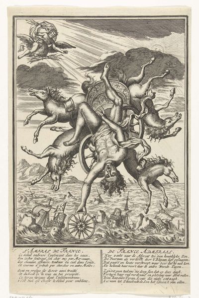 Editor: This is Christoffel van Sichem II's "Destruction of the Egyptian Army in the Red Sea" from around 1645. It's a print, an engraving, and immediately the detail is just astonishing. All those tiny lines capturing such a chaotic moment. What leaps out at you when you look at this piece? Curator: It's utterly biblical, isn’t it? But I am not sure which visual element makes this artwork especially remarkable. The sheer pandemonium etched into this tiny space is breathtaking, really! Look at those frantic figures flailing about—and those wonderfully rendered horses! And is that supposed to be Moses up top there? Is he surfing atop of a carriage? Almost looks like a strange burlesque show by those ancient Egyptians themselves. Editor: I thought that might be Pharaoh! The one losing his crown along with the battle. Curator: Ah, Pharaoh…perhaps! Though the lines are a bit wonky for regal grandeur! Tell me, does the artist capture something deeper, something beyond the mere storybook illustration, or is it purely performative? Does it feel like a genuine expression of faith, of something far greater happening? Editor: It feels… illustrative to me. Like a very skilled rendering of a well-known tale, a dramatic spectacle frozen in time. Though, seeing the Red Sea rendered in lines also gives it this feeling of otherworldly-ness. Curator: I feel the same! Still, a story can only become immortal if it contains many personal retellings. Now that's the paradox of faith and the artist. Well, thanks for walking me through it. Editor: Thanks for showing me all those little things to appreciate!