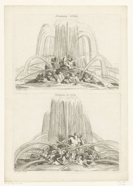 Louis de Châtillon created this print, "Fountains with putti and mermen," sometime in the 17th or early 18th century. During this era, garden fountains were powerful symbols of status and control over nature, reflecting the social hierarchies of the time. These fountains, populated by putti and mermen, embody the period's fascination with classical mythology and its use in allegorical representation. Putti, often seen as symbols of innocence and love, contrast with the mermen, who represent the wildness and mystery of the sea. Together, they evoke themes of desire, fertility, and the taming of natural forces. Note how this print, with its detailed rendering, attempts to capture the spectacle and drama of the fountains, inviting viewers to imagine the sensory experience of water, sound, and movement, thus engaging with the historical dialogue between nature, art, and power.