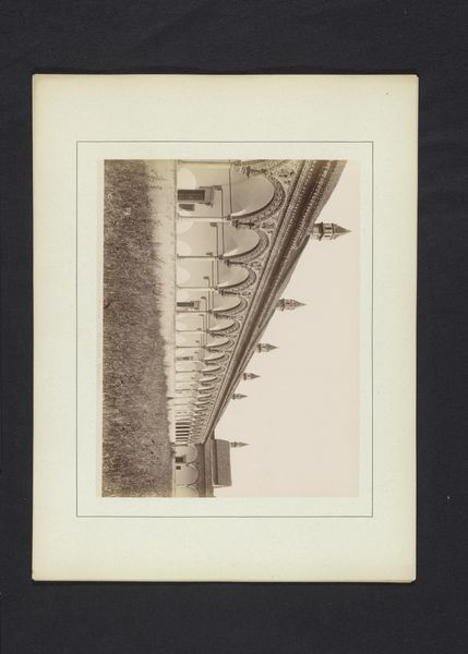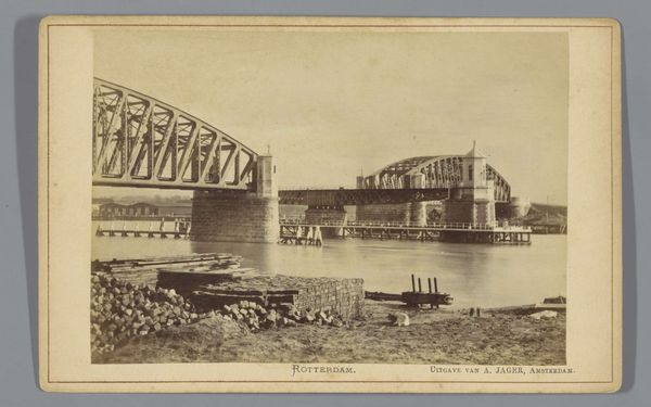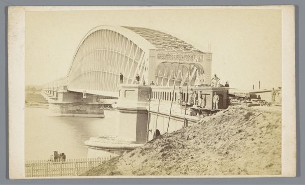 Curator: This albumen print, entitled "Kuilenburg 30 Augustus 1868," possibly taken that year by Johann Heinrich Schönscheidt, presents a stark cityscape. What strikes you about it? Editor: Its impressive industrial geometry! The colossal iron bridge dominates, but I'm equally drawn to the textured earth and modest fence running along the river's edge. The sepia tone lends a real sense of age. Curator: Absolutely. Beyond the aesthetic appeal, consider the sociopolitical implications. Railway bridges like this dramatically reshaped the Netherlands in the 19th century. They epitomize modernization, facilitating trade and altering conceptions of time and distance. Editor: Yes, and let's not forget the sheer labor and material involved. Building such a structure would demand massive quantities of iron and a huge workforce. How were these resources extracted and assembled? Whose labor built it, and what were their conditions? Curator: That's critical. And to dig a bit deeper, consider who benefited from this progress. New infrastructure wasn't always evenly distributed in its benefits and often overlooked impacts on communities and environments. Editor: Thinking about photography itself, the albumen process requires careful handling of materials and represents the increasing intersection of science, craft, and art in the 19th century. Curator: Precisely! It democratized image-making, opening doors to a wider public, and yet, the technologies of representation are never neutral. Early photography helped solidify certain power dynamics and ways of seeing, for example, in shaping the modern gaze. Editor: It all feeds into larger economic and social networks. It really gets one thinking about industrial production and the circulation of both goods and images, doesn't it? Curator: Precisely. Hopefully, this analysis illuminates both the overt grandeur and the layered meanings embedded within Schönscheidt's cityscape. Editor: A picture truly worth a thousand words, revealing not just a bridge but the web of social relations within which it was constructed.