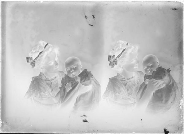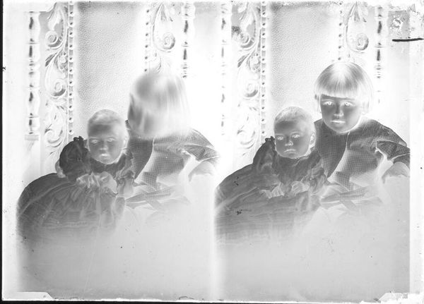 Curator: This small photographic print at the Harvard Art Museums by John Deusing captures two portraits of a woman with a baby. It certainly has an unusual mood. Editor: Yes, it’s haunting, with the stark inversion of light and shadow. The composition, doubled, almost feels like a symbolic representation of duality, perhaps motherhood itself. Curator: I see the repetition more as a reflection of Victorian portraiture conventions, a desire to capture and preserve a particular social image and maternal bond. The inverted tones create a ghostly echo. Editor: But the inversion also disrupts our reading. We are compelled to look beyond the surface to grasp the underlying narratives of nurture and family, so often idealized and yet so fraught with complexity. Curator: Agreed. There is also a starkness here. The symbolic weight feels immense for such a small object. The image burns itself into memory, questioning ideas about motherhood. Editor: The stark tonal range allows for this intensity. A closer look reveals Deusing's careful rendering of texture and form, pushing the medium beyond mere representation. Curator: It's a powerful testament to the layered meanings embedded within something seemingly simple. Editor: An unnerving and compelling work.