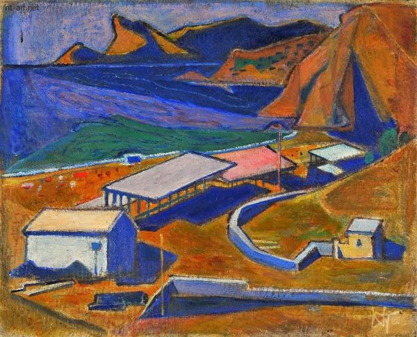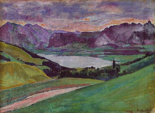 Nicholas Roerich made "Wisdom of Manu," sometime in the 20th century, using tempera on canvas. Look at how Roerich builds up the image with these tiny, almost pointillist marks. It’s like he's knitting the whole scene together, one little stitch at a time, letting the painting emerge slowly. There’s a real materiality to this work. You can almost feel the graininess of the tempera paint, the way it sits on the canvas, dry and chalky. The colours—muted blues, greens, and browns—create a kind of dreamlike atmosphere. Then you see that red fish-monster thing in the water! It completely interrupts the calm of the landscape. I love the way that one disruptive mark just throws the whole picture off-kilter. Roerich reminds me of Hilma af Klint, especially with the way he blends mystical themes with landscape. He’s creating a space where ideas and images can float freely, inviting us to bring our own interpretations to the table. Ultimately, art is about opening up possibilities, not closing them down.