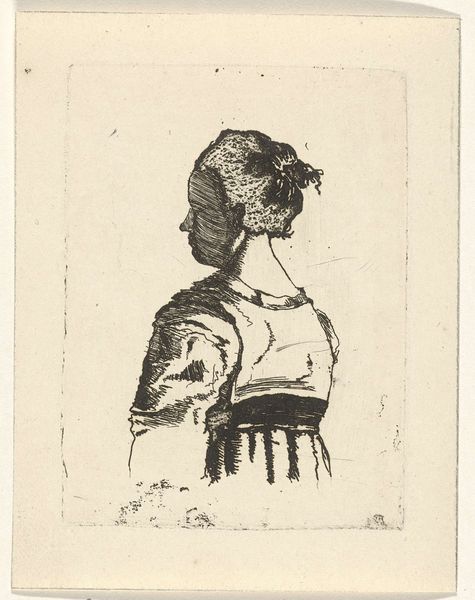 This is Louis Bernard Coclers' diminutive etching, "Head Study of a Young Woman with Hat." Its size enhances the immediacy of the subject, inviting a close, almost intimate inspection. The texture created by the etched lines, particularly in the stark contrast between the hat and the shadowed background, produces a captivating visual rhythm. Note the use of hatching and cross-hatching, techniques employed to build depth and volume within the monochromatic palette. Semiotically, the hat signifies more than mere fashion; it hints at social status and identity. Coclers masterfully uses light and shadow to not only define form but also to express mood. How does the stark contrast between light and shadow play with our perception? It is through these formal elements that the artwork speaks.