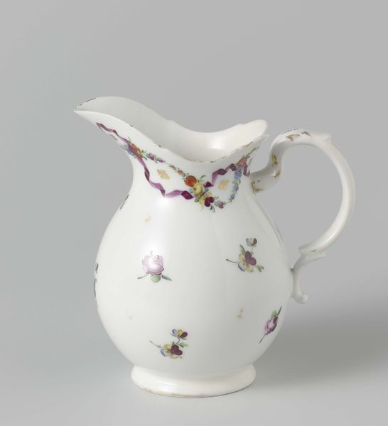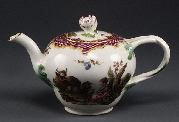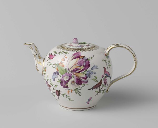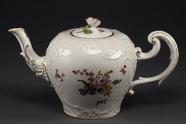 Curator: The way porcelain was consumed reflected distinct socio-economic relationships within eighteenth-century European society. Editor: Right, this "Teapot," made by the Meissen Porcelain Manufactory around 1745 to 1750, is simply charming! It’s so delicate and ornate. The fruit and butterfly designs, combined with the gilded touches, make it look so luxurious. How do you look at this piece? Curator: The porcelain itself provides a great deal of meaning. Porcelain was the 'plastic' of the 18th century. It represented something novel in its materiality, because the method of its production was carefully controlled. Only a small group of skilled labourers, such as those at Meissen, held this knowledge, creating intense social and economic power structures. Consider where the raw materials were mined and the labor conditions there. Who ultimately drank the tea from it and what was the relationship between the two groups? Editor: So, you’re suggesting we consider the teapot not just as an object of beauty, but as a product of a whole network of social relations and global resource extraction? That the beauty obscures these processes? Curator: Precisely. Its beauty, and even its Rococo style, mask the complex and sometimes brutal reality of its creation. The decoration alludes to exoticism, to a natural abundance far removed from the conditions of production. Why do you think the material culture of the Rococo favored asymmetry in objects like these? Editor: I never thought about a teapot this way, to be honest. The interplay of luxury and labor... it’s a lot to unpack! Curator: Indeed, seeing art through a materialist lens reveals fascinating stories of human ingenuity and exploitation that often remain hidden. Editor: This was such an interesting viewpoint, shifting my perspective on this delightful but loaded teapot.
