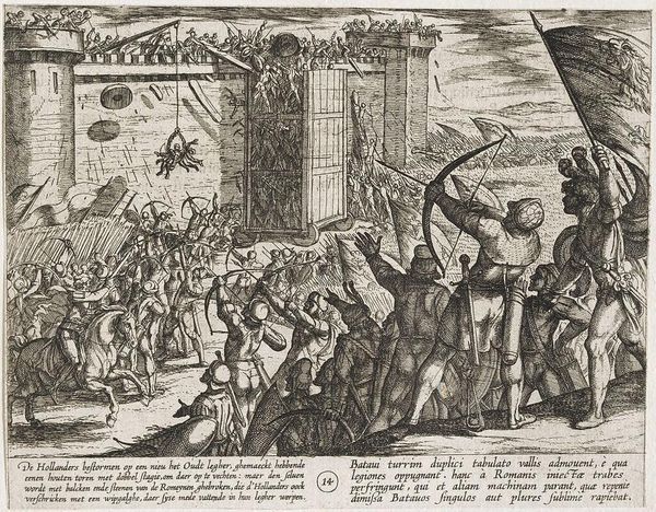 Curator: Let's delve into Antonio Tempesta's "Plate 14: New Attack on the Old Fortress, from The War of the Romans Against the Batavians (Romanorvm et Batavorvm societas)," created between 1611 and 1612. Editor: What strikes me is the frenetic energy captured in this engraving. The composition is dense, packed with figures in motion, creating a sense of chaotic conflict. I am intrigued to know your formalist interpretation. How do you decode the artwork’s structure and visual elements to convey its meaning? Curator: Notice the dynamic interplay between the dark, densely engraved areas depicting the attacking forces and the relatively lighter space representing the fortress. The artist’s masterful use of line creates a tangible sense of depth and spatial recession, pulling the viewer into the heart of the battle. The diagonals of the ladders and projectiles serve to activate the pictorial surface, instilling a sense of movement. How does that linearity function formally in the space? Editor: That linearity really does add a lot. So it seems you are implying that even without knowing the history, the formal choices guide us through the narrative, and it would not necessarily read this way if different. Would you say Tempesta manipulated techniques, such as foreshortening or perspective, to amplify the drama of the war? Curator: Precisely. Foreshortening and linear perspective are employed not for realistic depiction, but for theatrical effect. It serves to heighten the visual drama and draw us into the tumultuous scene. Editor: I see it now, the composition becomes as vital as the subject itself. Thanks for this insightful analysis; I now perceive the plate not only as a historical depiction but also as a sophisticated exercise in Baroque dynamism. Curator: Indeed. A rigorous visual analysis provides entry points into understanding both the historical context and enduring artistic qualities of the artwork.