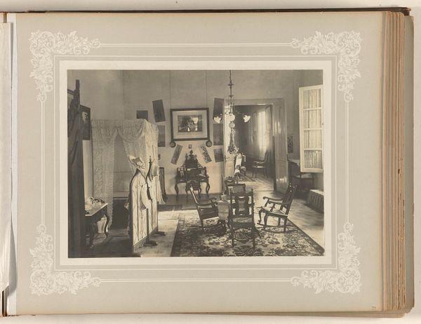 Curator: Oh, hello there. Look, we're standing before a gelatin silver print called "Foto uit archief Jan Veth", or "Photo from the Jan Veth Archive," dating roughly from 1902 to 1929, here at the Rijksmuseum. Editor: It feels so hushed, doesn't it? Like peering into a secret. All these receding doorways, a muted sort of poetry, it gives me a calm sense of loneliness. Curator: It’s remarkable how Veth captured depth here, isn’t it? You're drawn through this almost dream-like composition. The geometry is impeccable. Notice the series of receding rectangles. A room leads into another. And finally, it’s capped with a bright, almost aggressively centred window. The repetition of vertical lines between the door frames, shelves and chairs gives it a structural, if a bit overwhelming, quality. Editor: Overwhelming maybe. But something about that back room is compelling; maybe it is that sharp burst of window. It has an unsettling draw, with that blurred person sitting by it. Makes you want to write their story. To think they don’t know they’re in a photograph in a future museum. Funny how light in photographs does that to me; creates the feeling of both future and past all at once. I wish I knew their secrets, the picture itself feels like it has secrets hidden from us in these inky tones. Curator: Well, I find the textures are part of those secrets. Look at the rich fabric of the foreground chair contrasted with the smooth paneling on the walls. Or the soft diffusion of light throughout the scene, giving it this airy, ethereal quality. A masterful interplay of form and tone to draw the eye to particular spaces. Editor: Yes, exactly. This feels like more than just an interior, or someone simply experimenting with receding space; it’s capturing the essence of time itself. Curator: It's true. And that makes it endlessly fascinating. Editor: Fascinating indeed. Something in its silence. It holds so much.