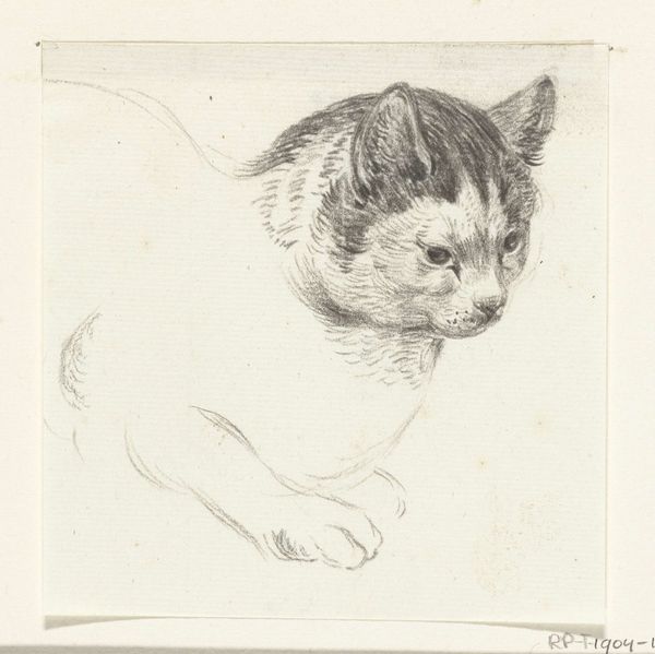 Jean Bernard created this black chalk drawing of a reclining cat in the late 18th or early 19th century in the Netherlands. It's a seemingly simple sketch, but consider the rise of natural history and scientific observation during this period. Drawings like these weren't just idle pastimes; they reflected a growing interest in documenting and classifying the natural world. Artists were part of this movement, using their skills to capture the details of animals with newfound precision. Think about the social context too. The Dutch Republic, known for its mercantile wealth, saw a rising middle class with an interest in art that reflected their daily lives. Animal portraits, like this cat, became increasingly popular. To truly understand this drawing, we might explore the scientific texts and artistic trends of the time, uncovering the ways in which art, science, and society were intertwined. The meaning of this artwork emerges not just from the image itself but from the historical currents that shaped its creation.