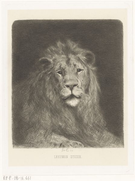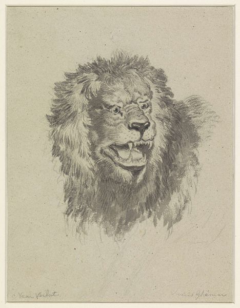 This is a pencil drawing by Bernard Willem Wierink, titled 'Head of a Lioness, Front View', housed here at the Rijksmuseum. The drawing presents a study in contrasts; the delicate pencil lines, which capture the soft fur and nuanced shadows, create a powerful image of the lioness. Wierink’s work embodies a tension between the precision of representation and the fluidity of the artistic medium. In this drawing, the artist uses the formal structure of symmetry to explore themes of power and vulnerability, drawing the viewer in to contemplate the complex essence of this regal creature. Consider how the careful balance of light and shadow adds emotional depth. It's not just a depiction of an animal; it is an exploration of form, representation, and the subtle power of the drawn line.