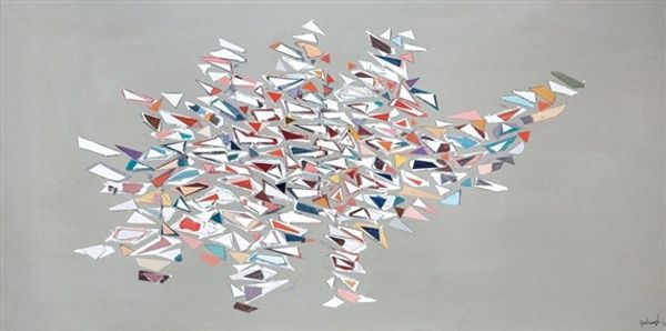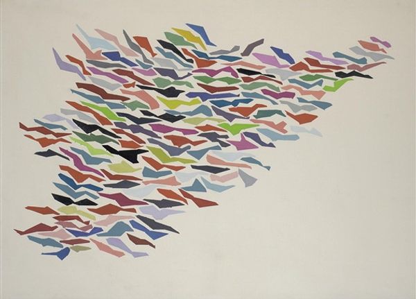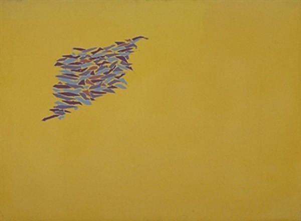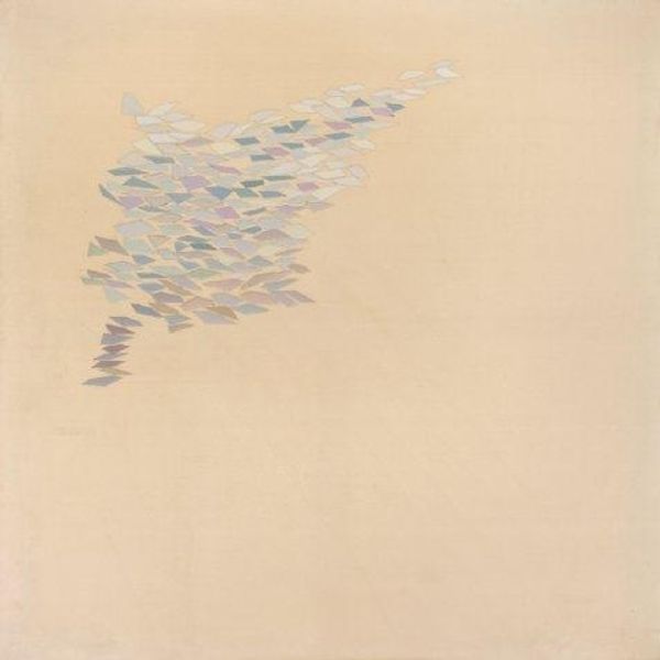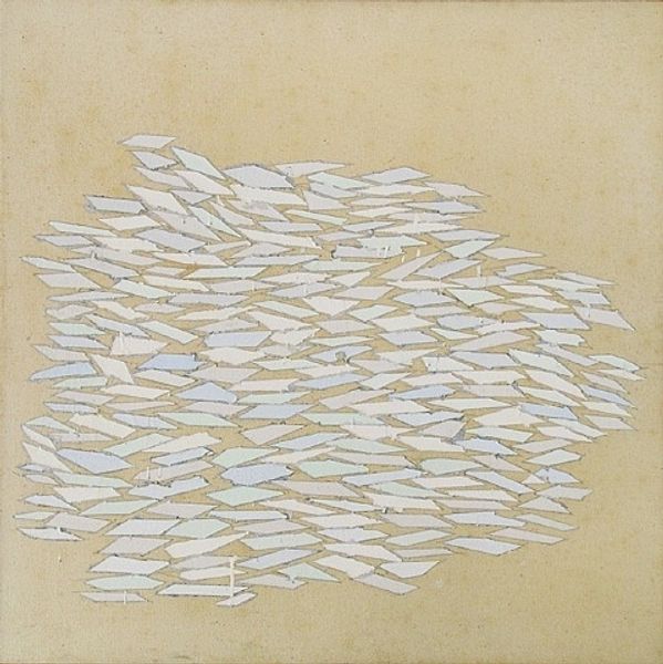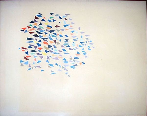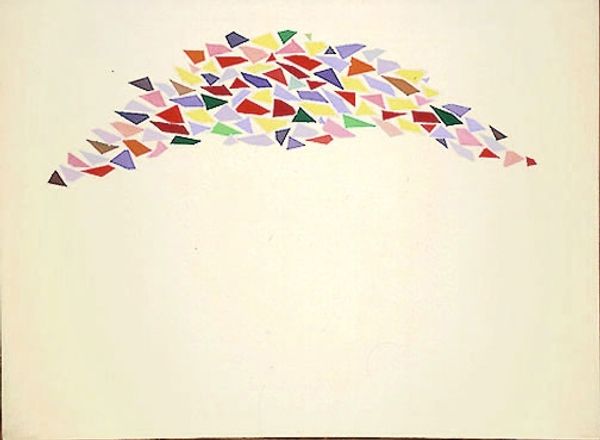 Editor: So this is "Colors with Yellow" by Robert Goodnough, made using acrylic paint. I am struck by how playful yet ordered it feels, with all these geometric shapes layering on top of each other. How do you interpret this work? Curator: I see in this work a dialogue with symbols of community, maybe even the murmuration of birds. The individual colored shapes remind me of isolated experiences which, brought together, form complex cultural narratives and emotional landscapes. Does that resonate with you? Editor: Definitely! I can see the birds now you mention it. Are there other possible cultural interpretations? Curator: Consider the repeating, almost musical rhythm in how Goodnough has applied these shapes. This evokes collective memory, a constant, almost unconscious reiteration of shared symbols that strengthen a community's sense of identity and its connection to the past. Could the 'yellow' operate here as a halo or the divine? Editor: That's an interesting perspective. It makes me think about how symbols evolve and take on different meanings. Curator: Precisely! And how artists manipulate and re-present those symbols to question, reinforce, or even redefine our understanding of the world and our place within it. What did you glean about abstraction in "Colors with Yellow"? Editor: I realize how seemingly simple shapes can be powerfully evocative. There is a language in the abstraction that can express profound themes of togetherness. Curator: Yes. Visual symbols have such deep and rich psychological implications.