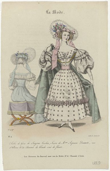 This is a print titled ‘La Mode’, made in 1830 in France, depicting two women's fashion. The print provides insight into the social and cultural values of the time, particularly regarding gender and class. Fashion plates like this one were a product of a rapidly changing society. The industrial revolution led to increased wealth and a growing middle class, who desired to emulate the fashions of the aristocracy. The image reflects the emphasis on elegance and refinement in women's fashion. The elaborate dresses, with their focus on ornamentation, reveal the importance of outward appearance in demonstrating social status and respectability. By studying fashion plates, alongside other historical sources, we can gain a deeper understanding of the complex social and economic forces that shaped everyday life in 19th-century France. These seemingly superficial images offer valuable clues about the values, aspirations, and anxieties of a society in transition.