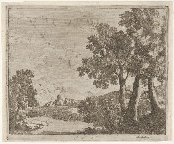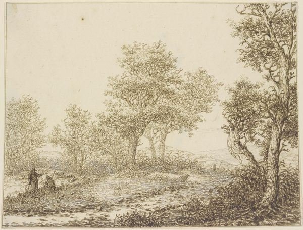 Editor: Here we have a drawing called "Waldausgang mit Blick auf einen Hügel mit einer Ruine, im Vordergrund drei Figuren und rechts ein Bauernhof," attributed to Karl Franz Kraul. It appears to be an ink and pencil work on paper, presenting a landscape scene. I’m struck by its quiet, almost melancholic mood. How do you interpret this work? Curator: That melancholic feeling, I think, stems from the ruin dominating the horizon. It speaks of lost empires, of time's relentless march. Notice how it's framed by the trees, like a memory half-recalled. And consider the figures in the foreground – are they simply passersby, or do they represent humanity's relationship to the past, perhaps dwarfed by history? What emotions are stirred within you when observing the ruined castle versus the figures? Editor: I suppose I hadn't considered the figures quite that deeply. The contrast does make you wonder if they’re on some sort of pilgrimage, a search for meaning amidst the remnants of something grand. I also notice the birds; do they hold significance? Curator: Ah, the birds! They often signify freedom, the soul, transcendence. Their flight contrasts with the stillness of the ruin, perhaps a commentary on hope even in the face of decay. Also, a peasant house appears far off to the right of the piece; do you feel it strengthens this message? Editor: Yes, that tension between decay and daily life, or aspiration. I find myself seeing more layers with each detail. Thank you, the birds now give the landscape an optimistic touch. Curator: And I feel my own sense of the symbolism is greatly enriched by sharing my understanding, and hearing your own insights. Each little component of this landscape provides an element of art and a sense of place for the era.