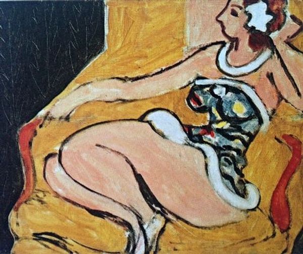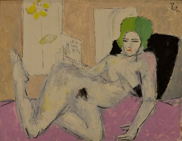 Curator: Ding Yanyong’s "An Artist and His Model", dating to 1971. It’s an acrylic painting depicting two figures, quite intimately posed. What’s your initial reading of this artwork? Editor: It strikes me as possessing a kind of awkward tenderness, even if rendered with crude expressiveness. There is a naive quality that is somewhat beguiling, wouldn’t you say? The bold palette seems intended to amplify some hidden vulnerability in their rapport. Curator: The colour choices are definitely important, I agree. Look at how Yanyong articulates the contours, employing fauve-like saturated colors. The vibrant green in the background contrasts vividly with the model's peachy skin tones. And notice how their bodies are rendered: simplified forms, reduced to their essence. There’s a conscious flatness, undermining any illusion of depth or conventional sensuality. Editor: The simplification echoes a turn away from classical forms, as figures are increasingly viewed as part of their surrounding environment, becoming mere abstract colour planes. We see an assertion of modernity, but did this challenge societal values about public displays of nudity and artist/muse relations? The Cultural Revolution was in full swing then. Curator: It's essential to recall the cultural context. Although part of an avant-garde circle early on, Yanyong did attempt to revive Chinese traditional art and calligraphy when conditions permitted it. These later figural works, while raw and spontaneous, represent an effort to harmonize avant-garde practice with Chinese conventions. Editor: Do you feel that balance always resolves itself in the piece? Or might we perceive the raw expressiveness as speaking to something deeper about the suppression of individualism during that period? Could the seemingly careless style also signal dissent? Curator: The figures, though simply rendered, seem to retain both the vitality of human life, and its potential constraints and limitations. Whether intentional or not, the very starkness suggests much. Editor: So the political undercurrent subtly shapes the aesthetic experience, reflecting both social mores and artistic choices, despite a vibrant facade? A valuable, yet very sobering thought. Curator: It encourages us to look past immediate surface, reminding us of both inherent structural choices, and those dictated by social circumstances.