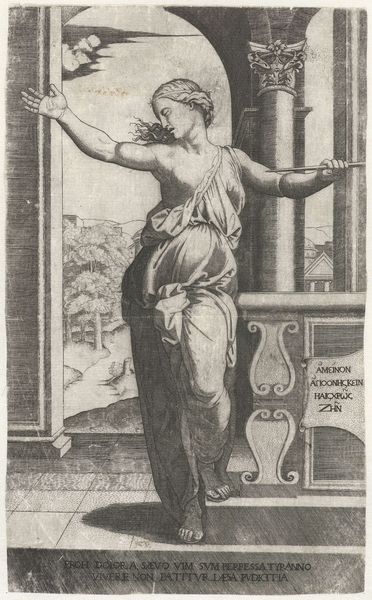 Editor: We're looking at Enea Vico's 1541 engraving, "The Suicide of Lucretia," here at the Rijksmuseum. It's quite striking how detailed the lines are for such a small print, almost creating a sense of movement in Lucretia's pose. How do you approach a work like this, focusing on its physical production? Curator: For me, this piece screams of labor and the commodification of classical narratives. The meticulous detail wasn't just for artistic expression; it was about demonstrating the engraver's skill, a valuable asset in a competitive print market. The very act of engraving, a demanding and time-consuming process, transforms Lucretia's story into a tangible object, something to be owned and circulated. Editor: So you're saying the material and process influence our understanding of the subject? Curator: Absolutely! Consider the role of prints in disseminating knowledge during the Renaissance. This image wasn’t just passively admired; it was actively reproduced, distributed, and consumed. This act, this market, helped spread certain idealized images or political commentary, shaping perceptions of women, honor, and power. What details jump out at you, thinking about the means of production? Editor: The inscription "TOMASIVS BARL. EXCVDEBAT" at the bottom. It makes me think about the printing house, the workshop where these images were replicated. Curator: Precisely. The existence of that name acknowledges a whole network of labour involved. We often see art through the lens of individual genius, but the prints remind us that artistic production was very much a collaborative and commercial venture. They also give insight into where these materials would have come from and who was being contracted to fulfill each piece of this creation. Editor: That shifts my understanding quite a bit. It makes me wonder about the accessibility of this piece to a wider audience and who would be engaging with it and how. Curator: Indeed! Analyzing art from a materialist perspective brings attention to the often overlooked economic and social dimensions embedded within even seemingly straightforward historical depictions.