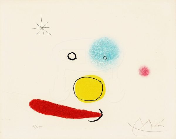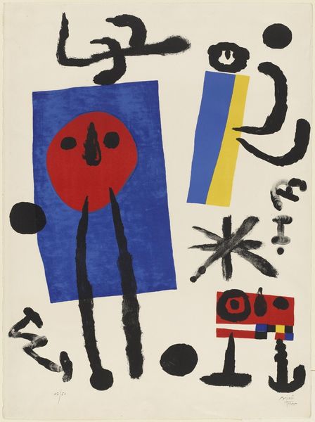 Curator: Let’s spend a moment here, with Joan Miró's "La Biche Chantant la Tosca," created in 1969. It’s a mixed-media work, an intriguing dance of forms. Editor: The instant feel? Playful, absolutely. A bit chaotic too, maybe? All these shapes feel like they're about to burst off the canvas. I feel joy and confusion! Curator: That chaos, as you call it, is pure Miró. It echoes the surrealist exploration of the subconscious. Notice how the lines are delicate yet sure, the black forms almost cartoonish in their simplicity. Those forms feel archetypal. What do they stir for you? Editor: It feels primordial—cave paintings and constellation charts mixed into one visual language. The "deer" in the title is completely abstracted, a gesture of something wild and free. Is it absurd to say it seems a little heartbroken? Curator: Not at all! Miró often juxtaposed lightheartedness with profound emotions. Those scattered shapes, the red dots, the encircled eye... they feel almost like coded symbols from a shared human experience. Think about the cultural resonance of the "deer" image across mythologies: freedom, grace, but also vulnerability. Editor: And Tosca? Placing this primordial deer alongside Puccini’s opera adds another layer, a clash of the elemental with high artifice. What do you suppose he's playing with? Curator: That interplay is vital, I think. Miró was poking at the supposed separation between "high" and "low" culture. Both deer and diva can sing. One from nature, the other from human artistry, yet each is a powerful symbol. Editor: A song nonetheless, regardless the setting, whether high brow or primitive! Now I can not but hear a slightly off-kilter aria of a deer amidst the cosmos. Curator: Exactly! Ultimately, it feels like Miró reminds us to look beyond conventional beauty and meaning. Editor: Right, it’s about finding the unexpected song in everything, in the wild and cultured both. Beautiful.