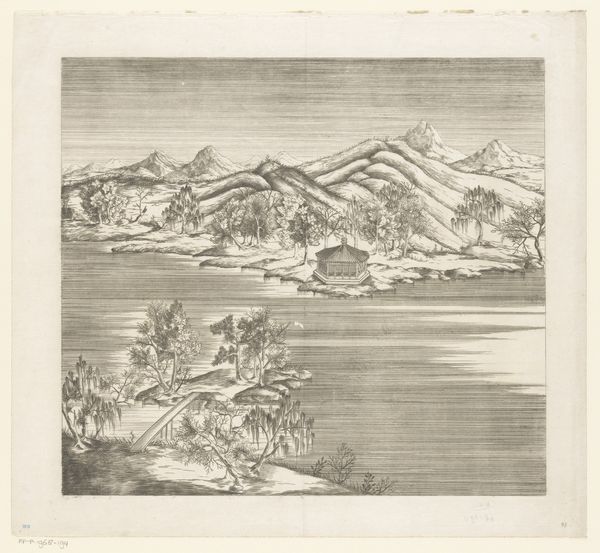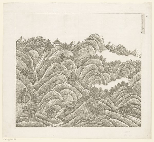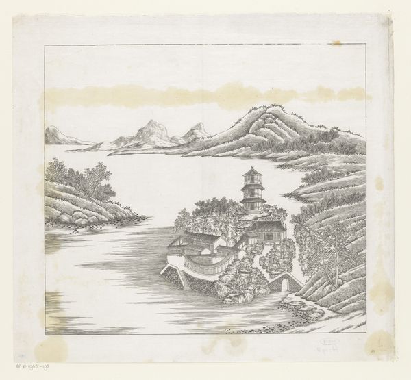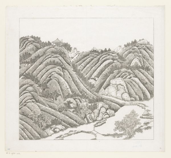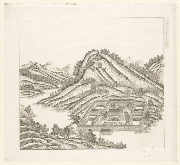 Editor: This is "Gezicht op een deel van het keizerlijk zomerpaleis in Chengde (Jehol) te China," a drawing in ink on paper by Matteo Ripa, made between 1712 and 1714. It's such an intricate landscape. All the fine lines create a sense of depth. How do you read the composition of this drawing? Curator: I appreciate how you're already thinking about the composition. Note how the image plane has been carefully organized into distinct horizontal zones, each exhibiting specific textures and patterns of light and dark. Do you notice the rhythmic repetition of the mountainous forms in the background, contrasting with the architectural geometry in the middle ground and then, again, with the organic patterns in the foreground? Editor: I see what you mean. There’s a sort of balance created between those architectural lines of the Imperial Summer Palace buildings, and the rolling hills in the foreground, yet it remains very linear, it is almost mathematical. How do these planes create depth in the composition? Curator: Depth is primarily achieved through careful modulation of line weight and density, wouldn't you agree? See how the lines in the foreground are bolder, more defined? Editor: Yes, I do see that now. Almost as if they're competing with one another to come to the front. That use of line is interesting; it seems so simple but is so powerful in creating layers. Curator: Indeed, observe how a consistent approach to formal arrangement brings visual harmony to what could easily feel disparate and incoherent, don't you think? This ensures the viewers eyes flow easily, creating a satisfying viewing experience. Editor: That’s true. Focusing on just those structural elements of line and texture gives a new perspective on what makes this artwork so compelling.