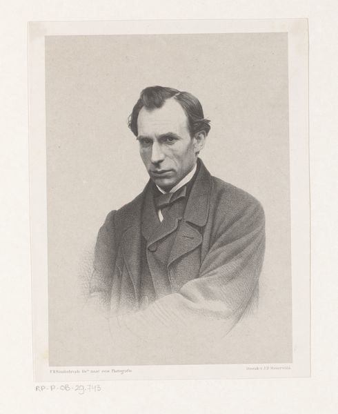 Curator: Before us we have a gelatin-silver print dating back to 1861. Joseph Dupont captured this portrait of Édouard Dujardin. Editor: There's a certain intensity to the subject's gaze; it's quite arresting. And the light, almost sepia tones, give it a strong feeling of gravitas, like a man burdened by heavy thoughts or great purpose. Curator: Dujardin was indeed a prominent figure, a novelist, and playwright associated with the Symbolist movement. Looking through that lens, we can see this image as more than just a portrait. How might this representation intersect with notions of masculinity, authorship, and the artist's role in 19th-century society? Editor: Symbolism lends itself, and certainly here, to the iconic. He presents with features exaggerated, perhaps, by photographic constraints of the time. But think about the beard—the established trope for masculine wisdom, yes, but more pointedly, an allusion here, maybe, to the prophetic beards of religious figures of the past? And note the almost aggressive formality of his dress! Curator: Absolutely, there's an element of constructed persona. In feminist theory, we consider how such portraiture often served to reinforce patriarchal structures, positioning men as the primary subjects of art and knowledge. Editor: His tie looks somewhat unkempt, intentionally perhaps, or simply, reality seeping through that careful artifice of respectability. One wonders if it symbolizes his spirit. His art breaking from the conformist demands of societal norm? Curator: Yes, precisely. The slightly disheveled attire can be interpreted as a subtle sign of rebellion, a characteristic often associated with avant-garde artists challenging societal conventions, a powerful way to read these visual cues beyond face value. Editor: Examining the work of Dupont reveals how the photographer positions Dujardin through potent symbols, both conventional and disruptive, speaking volumes about both subject and, fascinatingly, how he wants him to be viewed. Curator: Thinking about it now, perhaps, by looking closer, these early portraits gave the subject agency within visual media in an entirely new, disruptive way for its time, something which feels radical when placed within history.