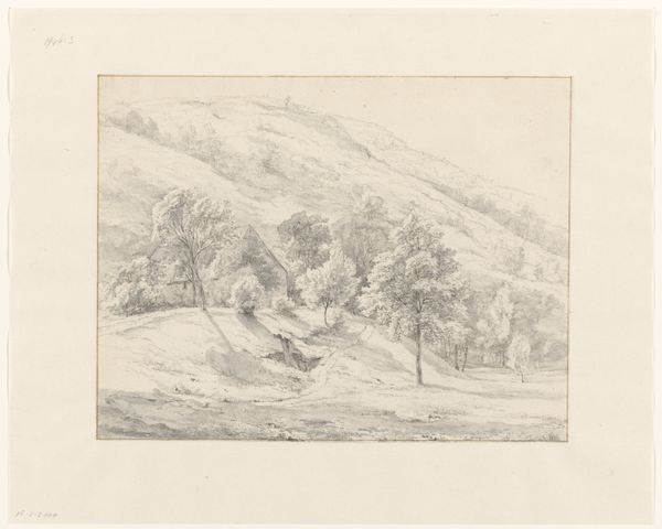 Curator: I'm immediately drawn in by the tranquility. It's so muted and quiet, almost dreamlike, with a lovely, delicate composition. Editor: Indeed. What you are sensing may originate from a perspective formed by Bilders’ romantic spirit, here expressed through “Gezicht op het dorpje St. Ange in Savoije,” which roughly translates to "View of the Village St. Ange in Savoy." Executed in pencil, somewhere between 1848 and 1865. We are fortunate enough to have it here at the Rijksmuseum. Curator: I appreciate the subtle rendering. The soft pencil strokes create such an ephemeral effect. I can almost feel the air, a tangible stillness about it. What strikes me most are the forms that resemble grave stones in the foreground... How does that relate to its contemporary culture? Editor: Considering the Romanticism movement and the growing middle-class’ engagement with the art market, this image offered a glimpse into an untouched, somewhat melancholic space, feeding into the desires of a society grappling with industrialization and rapid urbanization. The resemblance to gravestones speaks, perhaps, to a romanticized meditation on time, history, and the fleeting nature of life. Curator: It makes me wonder about the experience of viewing such work at that time. I mean, who were the audiences engaging with these landscapes, and what did it represent for them? The choice of such modest materials is really something. I would have expected richer pigment in this period. Editor: That's a crucial question to raise. While landscape painting, like this work, offered a form of escapism and an idealized view of nature that had implications in promoting national identity formation, these themes could reach a wider audience by leveraging print culture. Furthermore, the pencil itself suggests intimacy, like a personal reflection open for the public to witness and interpret. Curator: Well, considering its continued appeal, Bilders successfully captured something profound about our relationship to place and memory. Editor: Absolutely. And reflecting upon those landscapes also makes us think about how these themes speak to pressing ecological concerns nowadays, perhaps creating a shared space of consideration across time and viewers.