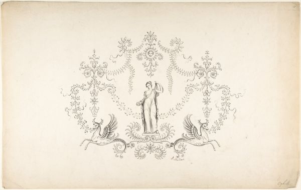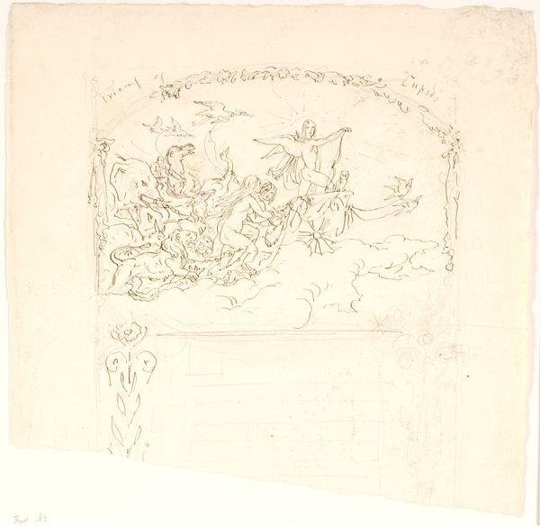 Lorenz Frølich created this pen and brown ink drawing on paper. It uses traditional fine art materials, but also seems to invite us into a world of classical mythology, far from the everyday. The monochromatic tones create a sense of depth, with delicate linework defining the figures and ornate frame. You can almost feel the artist's hand moving across the paper, capturing the forms with precision and grace. This emphasis on the artist's skill is part of a long history of connoisseurship, an appreciation for how something is made. Frølich engaged with traditions of classical art, visible in the poses and drapery of the figures. These recall earlier aesthetics that valued beauty and idealized form. This piece reflects broader social issues of labor and class, particularly the artist's role within a system of patronage and cultural production. The drawing is relatively small, but is charged with meaning through its historical references. The artist asks us to consider the relationship between human experience and artistic expression.