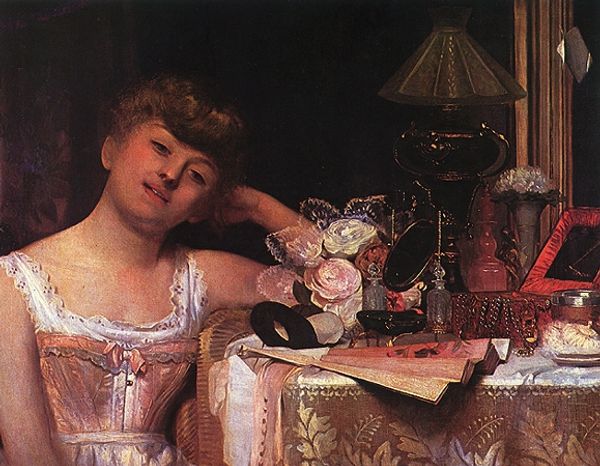 Lawrence Alma-Tadema created this oil on panel artwork titled ‘The Golden Hour’ sometime in the late 19th century. It depicts a red-haired woman gazing intently at a statuette. Alma-Tadema was a master of historical genre painting, specializing in idyllic scenes of antiquity that were popular among wealthy Victorian collectors. The image invites us to contemplate the Victorian era's fascination with classical antiquity, which shaped not only art but also architecture, literature, and social ideals. The woman's dress and hairstyle are contemporary to the period, creating a juxtaposition between past and present. This allowed viewers to imagine themselves as part of a continuous lineage stretching back to the ancient world. To understand this work more fully, one might consider the artist's biography, exhibition records, and the writings of contemporary art critics, all of which offer valuable insights into the cultural context in which this painting was made and received.