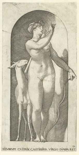 Curator: Here we have Hendrick Goltzius’ engraving, “Rechtvaardigheid,” or "Justice," likely created sometime between 1578 and 1709. It's currently held here at the Rijksmuseum. Editor: Striking! My first impression is the incredible detail achieved with engraving. The subject's muscularity and pose evoke a sense of both power and vulnerability. It seems like the artist put a great deal of work into capturing texture and luminosity. Curator: Goltzius was a master engraver, and you can see that technical skill at play. Look at how he uses the burin to create the illusion of light reflecting off the figure's skin and the metallic surfaces. The physicality of the engraving process itself – the labour, the tools, the inking – it all speaks to the construction of meaning. It also speaks of mass production in his time, this image would have been accessible. Editor: Absolutely. Thinking about that wider distribution speaks to how concepts of justice are being disseminated, debated and visualized in society. Notice the symbolism at work: a nude figure, perhaps representing impartiality, holds a sword in one hand and scales in the other. She stands firmly, grounded in an allegorical space, a representation of an ideal— but what system are we meant to apply this ideal to, what class of citizen does it favor, who is absent? Curator: It's fascinating to consider how an engraving like this was received then versus how we interpret it now. The act of engraving allows for precision and repetition. The lines that form the image become a method for the mass distribution and consumption of the visual trope. It's easy to forget that this was labor that, no doubt, contributed to systems of economy and access in the Netherlands during this time. Editor: Yes, and consider how the very notion of justice is interwoven with power dynamics. The subject, though nude, carries both instruments of judgment and enforcement: balance and power. Is this an invitation to consider fairness, or a warning of its consequences? To see it placed in conversation with our moment, what feels most just to you today and to whom does that apply? Curator: Looking closer at the production of "Rechtvaardigheid" reminds us to scrutinize the circumstances under which representations of ideals— like justice — are created and consumed, and how their meaning and impact can change through space and time. Editor: Thinking about this representation of Justice compels us to question: whose justice, and to what end?