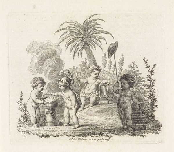 This unsigned print, titled "Afrika," presents a European vision of the continent. Dominating the foreground are two African figures. One, adorned with feathers, gestures outwards, perhaps in welcome or offering. The other crouches, focused on his bow. Palm trees evoke a sense of exoticism. The bow and arrow carry deep historical weight. Recall the archer figures in ancient Greek art, symbols of skill, strength, and conquest. Yet, here, the bow may speak more to a perceived "primitive" state, a loaded interpretation projected by the European gaze. We see this motif of the archer recurring throughout art history, always shifting in meaning with the prevailing cultural winds, molded by the anxieties and desires of those who depict it. The image is a potent symbol, a cyclical return of the European imagination grappling with the "other," an exercise in cultural memory constantly redefined.