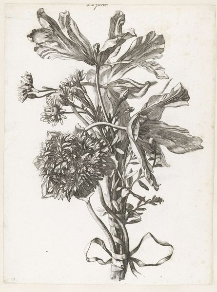 Curator: This delicate drawing, "Gladiool," thought to have been created sometime between 1887 and 1924, is by the Dutch artist Julie de Graag. The Rijksmuseum is fortunate to hold this piece. What's your initial take on this pen and ink sketch? Editor: My first impression is one of quiet fragility. The almost skeletal rendering of the gladiolus against so much negative space feels almost spectral, like a memory rather than a firm presence. There's something inherently melancholic about it. Curator: Absolutely. It almost feels like a pressed flower, doesn't it? Preserved, but also faded, vulnerable. De Graag often worked with nature as her inspiration, abstracting forms to their barest essence. Perhaps this evokes the passing of time, the life cycle. Editor: That's what resonates with me, too. I wonder about the symbolism inherent in choosing the gladiolus. They often represent remembrance and integrity, but they can also symbolize infatuation or even skepticism, a dichotomy perhaps reflective of De Graag's personal experiences as a female artist navigating a male-dominated world. Curator: That's insightful. I'm curious about the intense contrast against the stark white of the paper, how it plays with the line weight. She almost uses a musical notation in its lightness and delicacy! Almost a sort of ephemeral elegy on the page. Editor: Precisely. The high contrast certainly emphasizes a sense of dichotomy, perhaps reflecting on the lived experience of those who were ostracized in her time for their sexual or racial identity and artistic explorations. De Graag seemed dedicated to sketching natural shapes with almost an objective mechanical and scientific passion. Curator: Yes, this gladiolus then could act as a beautiful, simple memorial to those who are overlooked. De Graag encourages us to remember how even a seemingly simple image can provoke so much discourse on the impact that people had in their present day. Editor: It underscores the enduring power of quiet observation and how nature can become a silent yet potent symbol of resilience and resistance. It gives one a sense of introspection and almost of resolve in honoring one's identity and those from the past.