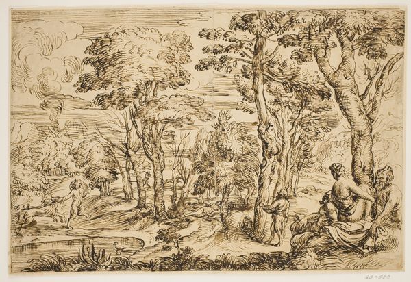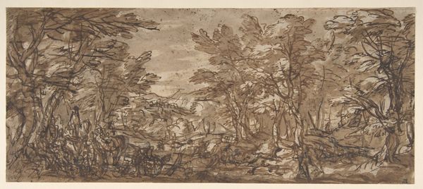 This is Claude Lorrain's drawing, "Sunrise (recto); Landscape with Figures (verso)", made with pen and brown ink, and heightened with blue wash. The composition of the landscape reveals Lorrain’s strategic use of line and form. Note how the trees act as framing devices, directing our gaze towards the distant, softly rendered castle. The meticulous linework in the foreground contrasts with the ethereal treatment of the sky and distant mountains, creating depth and atmosphere. Lorrain destabilizes the traditional landscape by integrating narrative elements within the natural setting. Figures are rendered with the same attention to detail as the flora, suggesting a harmonious relationship between humanity and nature. The precise articulation of space and the delicate balance between light and shadow reflect broader artistic concerns with perception. The drawing is an orchestration of nature and narrative, revealing the interplay between formal elements and cultural meanings, inviting us to explore the poetics of the landscape.