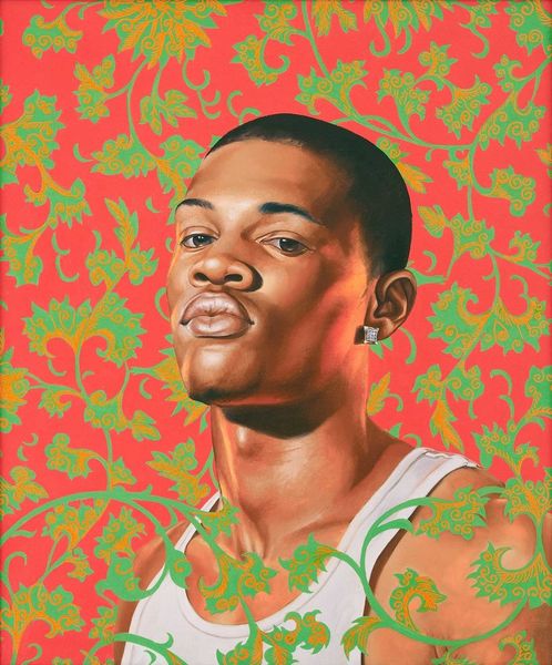 Editor: This is "Jerry I" by Kehinde Wiley, an oil painting from 2008. The way the figure pops against that ornate floral background is really striking. What do you see in this piece, particularly regarding its visual language? Curator: Wiley is a master of visual remixing. He consistently uses the language of power, traditionally seen in Western European portraiture, and recontextualizes it with young Black men. What’s interesting here is the explicit use of floral patterns. What do flowers symbolize for you? Editor: Well, they often represent beauty, fragility, or even the ephemeral nature of life, don’t they? But it’s quite a contrast with the figure’s confident pose. Curator: Exactly! It's the inherent tension. The floral background directly references historical fabrics used in aristocratic portraiture, signifying wealth and status. Wiley is actively placing Jerry within this canon. But how does this tension challenge the viewer’s preconceived notions of both portraiture and the individuals represented? Editor: So it's about reclaiming a space and rewriting history. The floral pattern isn't just decorative; it's a symbol with a deeper narrative. The subject’s direct gaze certainly commands attention, defying any sense of fragility suggested by the flowers. Curator: Precisely. He utilizes the vocabulary of classical art, imbued with cultural memory, to make powerful statements about identity, representation, and the enduring human desire for dignity and recognition. Do you think the bright clothing he is wearing distracts or supports Wiley’s vision? Editor: It certainly demands your attention, and pushes this toward pop art influences... I never looked at portraiture this way. Thank you for broadening my view! Curator: My pleasure. It’s through analyzing the accumulation of symbols that we understand how the weight of history shapes our present.