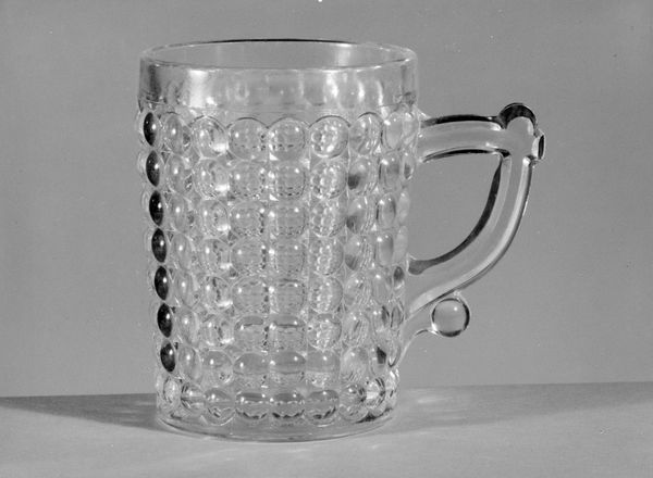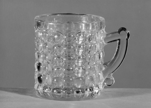 Editor: Here we have an exquisite piece of glasswork, "Milk Pitcher," crafted between 1870 and 1890 by Adams and Company. Currently residing at the Metropolitan Museum of Art, it strikes me with its tactile bubbled surface. What design elements particularly capture your attention in this work? Curator: Focusing on the visual vocabulary, note the interplay of transparency and texture. The uniform distribution of raised spherical elements across the pitcher’s body creates a complex field. Observe how light interacts with this field; each sphere acts as a tiny lens, distorting and refracting the light, thereby complicating our perception of the vessel's interior. Do you see how this manipulation affects the object's visual weight? Editor: Yes, I see it now! The texture creates a visual density despite the transparency of the glass. It seems almost heavier than it is. Curator: Precisely. Also, consider the handle and the base. These elements, while functional, are also integral to the overall composition. The handle, a clean, arcing form, provides a counterpoint to the textured body. Similarly, the stepped base grounds the piece, offering a visual anchor. Editor: So, it's a carefully constructed balance between different visual elements. It makes me appreciate it even more. Curator: Indeed. Through its meticulous formal arrangement, the “Milk Pitcher” invites contemplation on the very nature of material and perception. Editor: I'll definitely look at glassware differently now, with more focus on its materiality. Thanks so much.